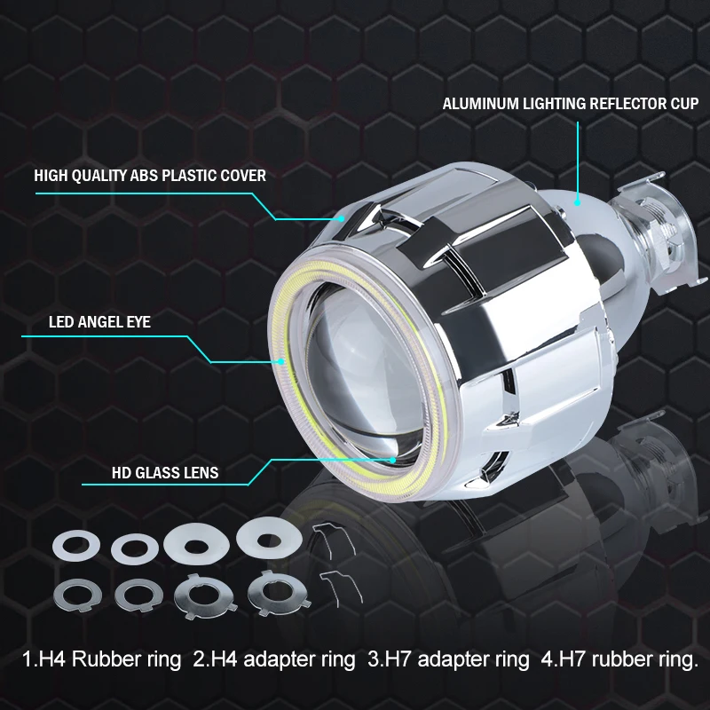 Спецификация:Объектив проектора размеры: 2,5 дюймовМатериалы линз: стеклоМатериал проектора: металлМатериал крышки: пластикСветодиодный цвет глаза ангела: белый/красный/синийВарианты светового луча: LHD/RHDLHD-левый привод, руль слева, автомобиль в России, США... и т. Д.RHD-правый Привод, steeКольцо колеса справа, автомобиль в Великобритании, Японии... и т. Д.Подходит для Фар H4, H7