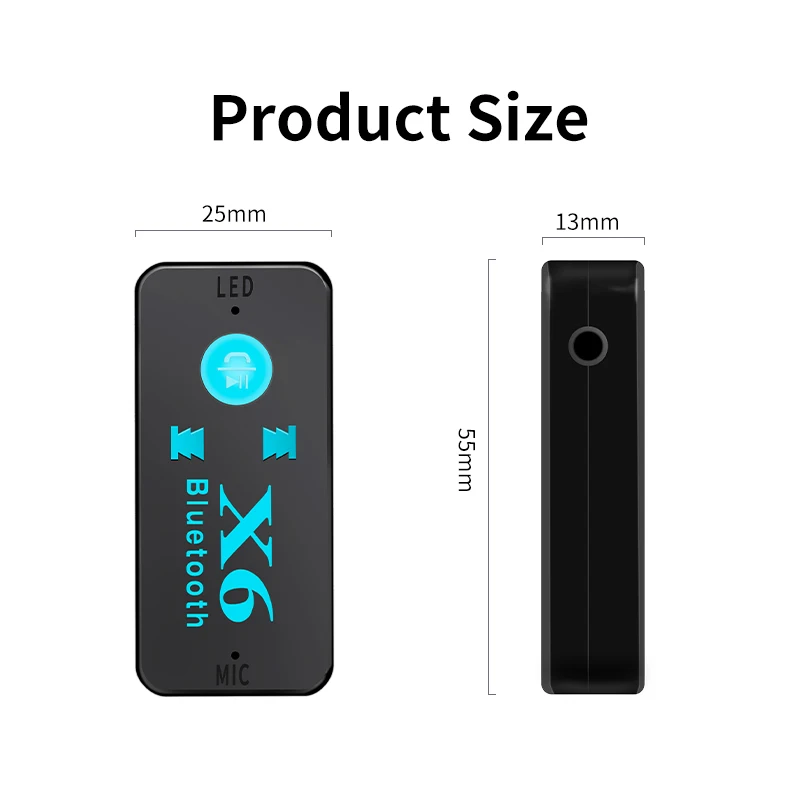 Модель изделия: BT-X6 Материал изделия: пластик Цвет изделия: черный Интерфейс Тип: 3,5 мм Версия Bluetooth: Bluetooth 5,0 Емкость аккумулятора: 100 мАч