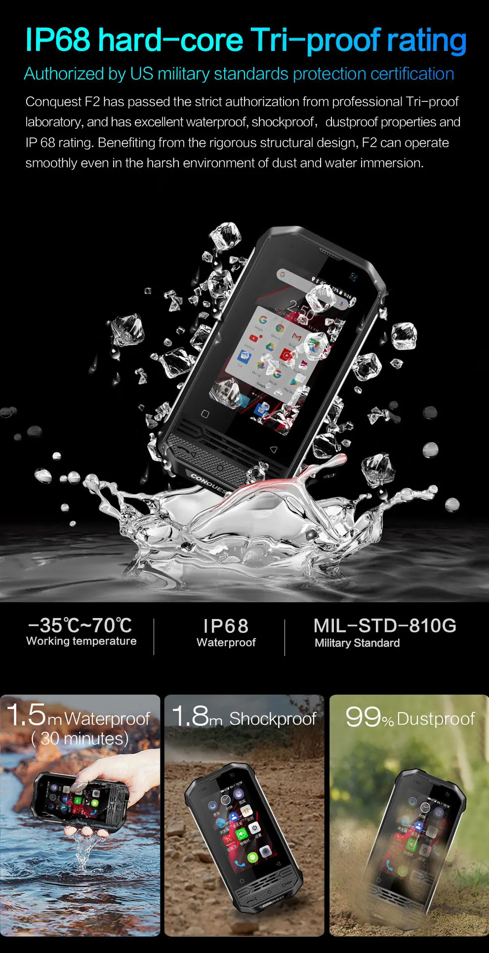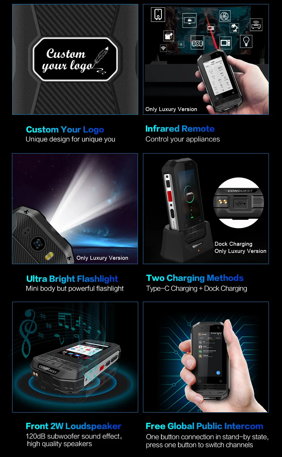 Роскошная версия F2-это версия F2 Upgrage, добавьте дополнительные функции: 1. Роскошная версия F2 поддерживает распознавание отпечатков пальцев; 2. Роскошная версия F2 поддерживает ультра яркий фонарик; 3. Роскошная версия F2 поддерживает заднюю камеру PDAF; 4. Роскошная версия F2 поддерживает инфракрасный пульт; 5. Версия F2 Luxury поддерживает компас; 7. Роскошная версия F2 включает в себя 3 дополнительных аксессуара: поясной зажим, веревки для ручек, док-станцию chager. Особенности: ✔Глобальная сеть 4G: показывает прецедентную скорость и преимущества производительности ✔Небольшой размер, высокая производительность ✔Оснащен ярким светодиодным ослепляющим фонариком ✔Звуковой эффект сабвуфера 120 дБ, высококачественные динамики ✔Полимерный съемный, мощный аккумулятор 3700 мАч ✔IP68 /MIL-STD-801G, 1,5 метров Водонепроницаемость, 1,8 метров ударопрочность, 99.9% Пыленепроницаемость