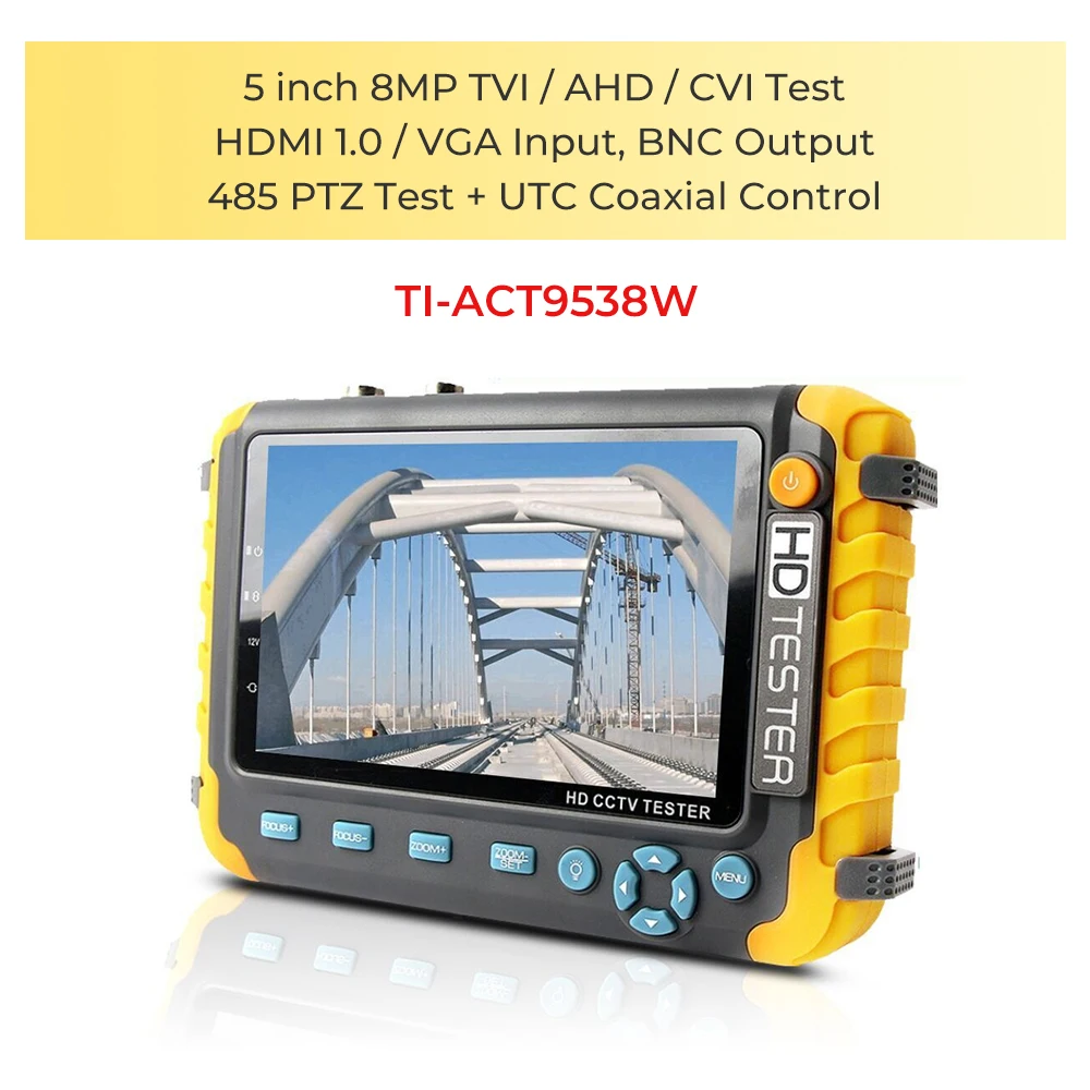 TI-IV5 = 8 Мп + 5 дюймов + разрешение экрана HD 800*480 + 8 Мп AHD + TVI + CVI/CVBS видео тестер + UTC (HD коаксиальный контроль, BNC коаксиальный Контроль PTZ, но не могу позвонить в меню камеры) + RS485 + UTP