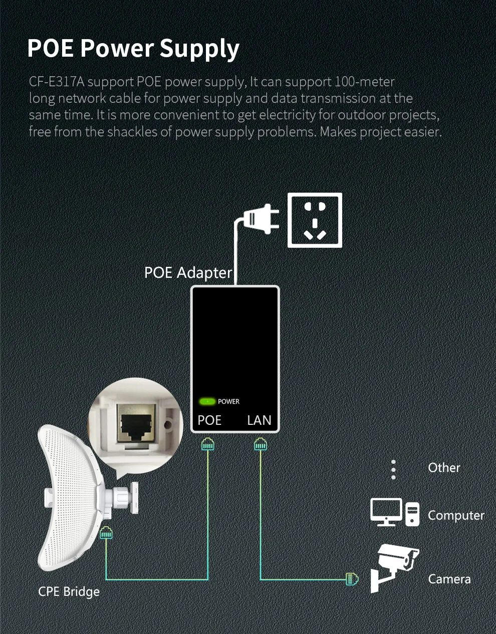 CF-E317A поддерживает источник питания POE, он может поддерживать сетевой кабель длиной 100 м для питания и передачи данных одновременно. Более удобно получать электричество для наружных проектов, без оков проблем с электропитанием. Делает проект легче.