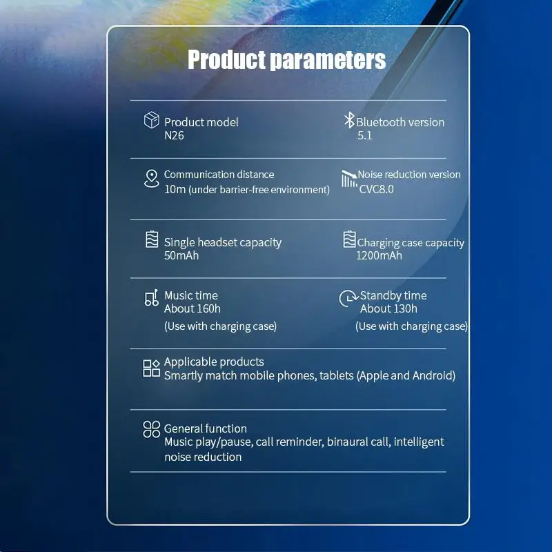 1. Модель: N26 2. Спецификация Bluetooth: V5.1 3. Профиль Bluetooth: A2DP,AVRCP, HFP;HSP 4. Рабочее напряжение: 3,1 V ~ 4,2 V 5. Напряжение зарядки: 5V-1A 6. Расстояние передачи:>10 м 7. Время вызова: 4-5 ч 8. Время воспроизведения: 4-5 ч 9. Время зарядки гарнитуры: 30-45 мин 10. Время зарядки зарядного устройства: 1 ч
