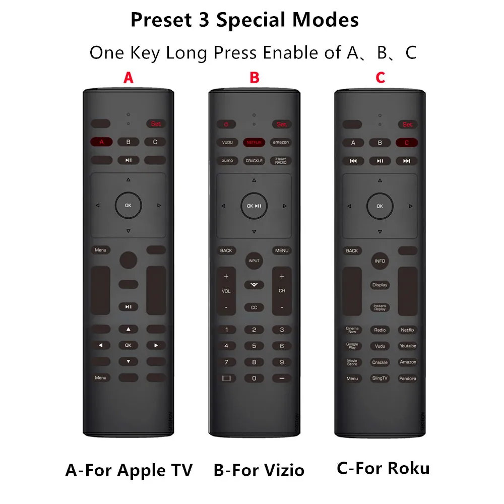 Тот же метод, нажмите и удерживайте кнопку B, чтобы переключиться на пульт дистанционного управления Visio TV, C Переключитесь на пульт дистанционного управления Roku TV.