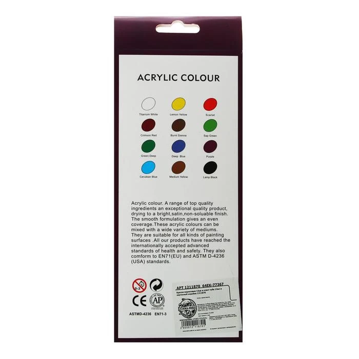 Сертификация Не подлежит сертификации и декларированию Набор (Да/нет) Да Цвет МИКС Лицензионный товар (да/нет) Нет Количество цветов 12 Объём, мл 12 Тип художественного товара Для художественных и графических работ Европодвес (да/нет) Да Вид упаковки Туба Температурное ограничение транспортировки НЕ НИЖЕ ℃ 0 Температурное ограничение не требуется Да Вид краски АкриловаяОчень красивое, элегантное украшение! можно подарить в качестве подарка,а так же как и помолвочное!себе заказывала в качестве подарка, очень понравилось!... Читать отзыв полностью...
