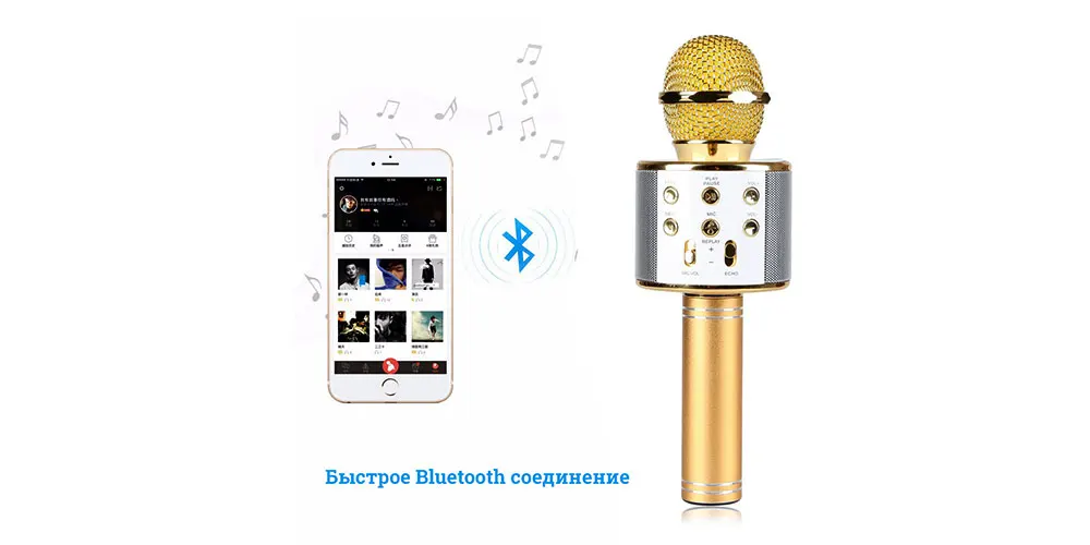 This microphone can be connected to the phone via Bluetooth connection, as well as play music from a USB flash drive, or from a microSD card.
