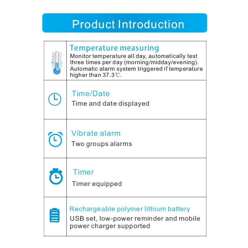 1. Измерение температуры тела: автоматически измеряет температуру тела в течение дня, и браслет будет автоматически оповещать о температуре> 37,3 ℃.