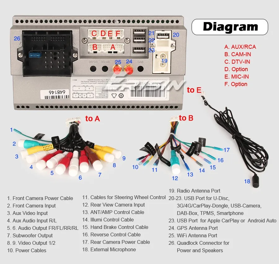 Может быть подключен к U-Disc, 3G/4G Dongle, CarPlay Dongle, TPMS-Device, DVR-Camera, DAB + Box, смартфону и т. д.