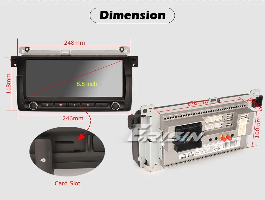 Этот блок имеет размер передней панели248 мм (ширина верха) * 118 мм (высота) * 246 мм (ширина дна). Чтобы убедиться, что товар подходит вашему автомобилю, пожалуйста, проверьте форму и размеры вашего оригинального автомобильного медиаплеера, что соответствует описанию в нашем списке перед подачей заявки.