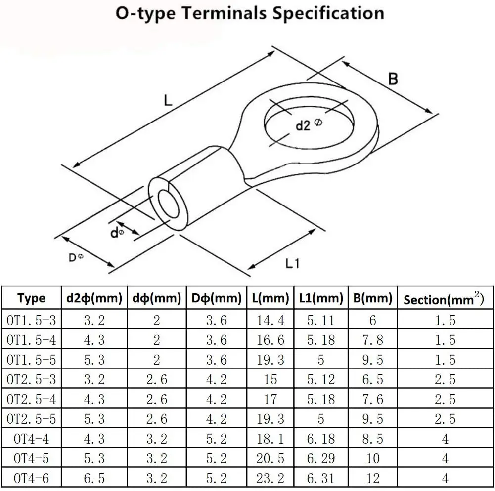 Спецификация: 25 шт OT1.5-3 25 шт OT1.5-4 25 шт OT1.5-5 25 шт OT2.5-3 25 шт OT2.5-4 25 шт OT2.5-5 25 шт OT4.0-4 25 шт OT4.0-5 25 шт OT4.0-6 25 шт UT1.5-3 25 шт UT1.5-4 25 шт UT1.5-5 25 шт UT2.5-3 25 шт UT2.5-4 25 шт UT2.5-5