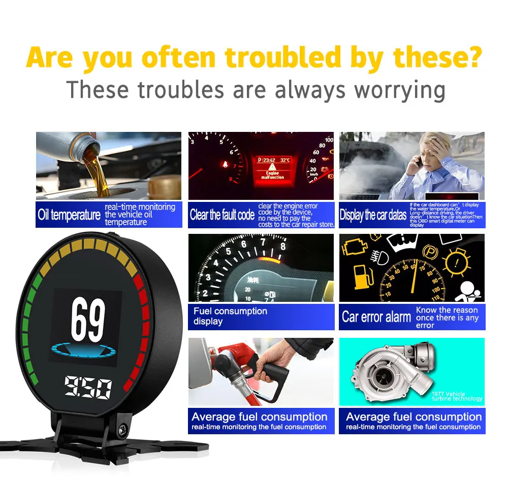 Автомобильный бортовой компьютер F10 Автомобильный цифровой OBD 2 HUD Дисплей скорость об/мин миль/ч расход топлива Tacho Turbo датчик температуры OBD2