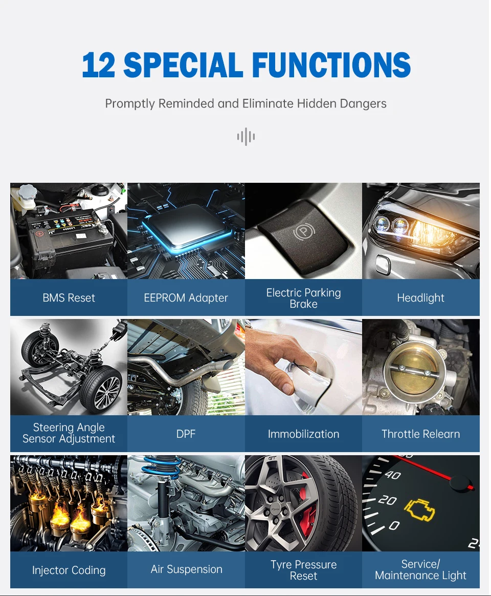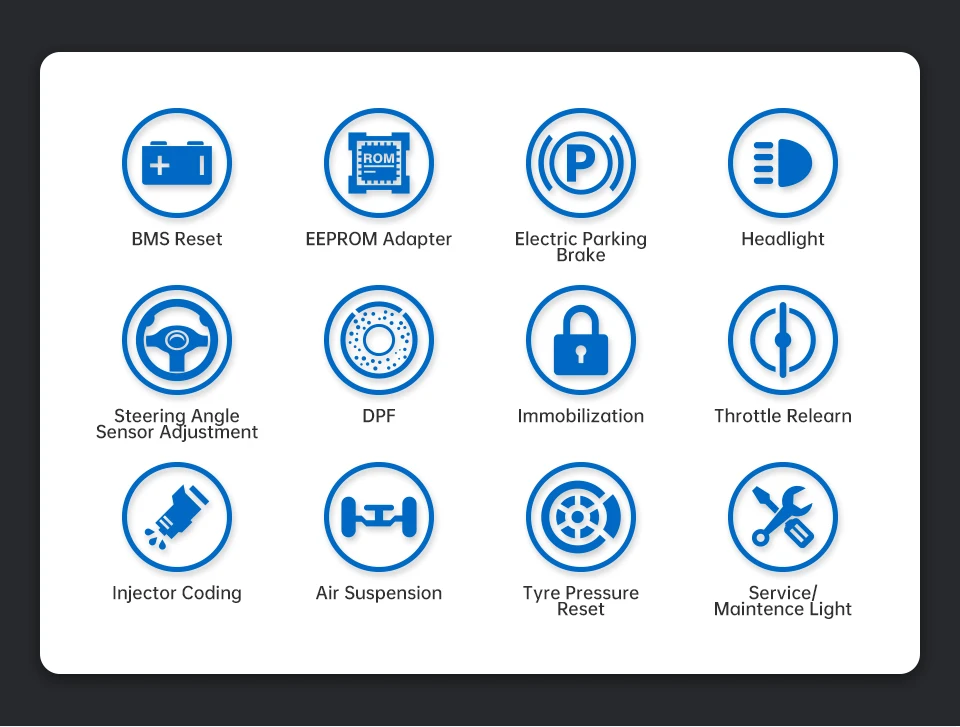 * Обслуживание сброса масла: выполняет сброс для системы эксплуатации моторного масла, которая вычисляет оптимальный интервал изменения срока службы масла в зависимости от условий вождения автомобиля и климата, и выключает предупреждающий светильник; * Электронный стояночный тормоз (EPB) обслуживание: Поддерживает электронную тормозную систему безопасно и эффективно, деактивируя и активируя тормозную систему управления, помогая в управлении тормозной жидкостью, открывании и закрывании тормозных колодок и устанавливая тормоза после замены диска или колодки, И т. Д. * датчик угла поворота руля (SAS) Сервис: выполняет калибровку для датчика угла поворота руля (SAS), Который постоянно хранит текущее положение рулевого колеса в качестве прямого положения вперед в датчике угла рулевого управления EEPROM. После успешного завершения калибровки автоматически очищается память датчика угла поворота руля. * Система контроля давления в шинах (TPMS) Обслуживание: функция обслуживания TPMS включает отображение сенсорных идентификаторов из ECU транспортного средства, ввод идентификаторов замены датчика TPMS и датчиков тестирования * служба DPF: выполняет множество функций для дизельной системы фильтров твердых частиц. Инструмент будет управлять регенерацией DPF, заменой компонентов DPF после замены блока управления двигателем. * Сброс BMS: повторное соответствие модулю управления и датчику моторизования для более точного обнаружения батареи, четкая оригинальная информация о низком заряде батареи и предотвращение обнаружения ложной информации о соответствующем модуле управления. * IMMO сервис: позволяет отключить ключи от утерянного транспортного средства и запрограммировать сменный брелок. EEPROM адаптер: работает со старыми моделями Автомобилей, когда это автомобильные чипы или ключ нужно сделать программист