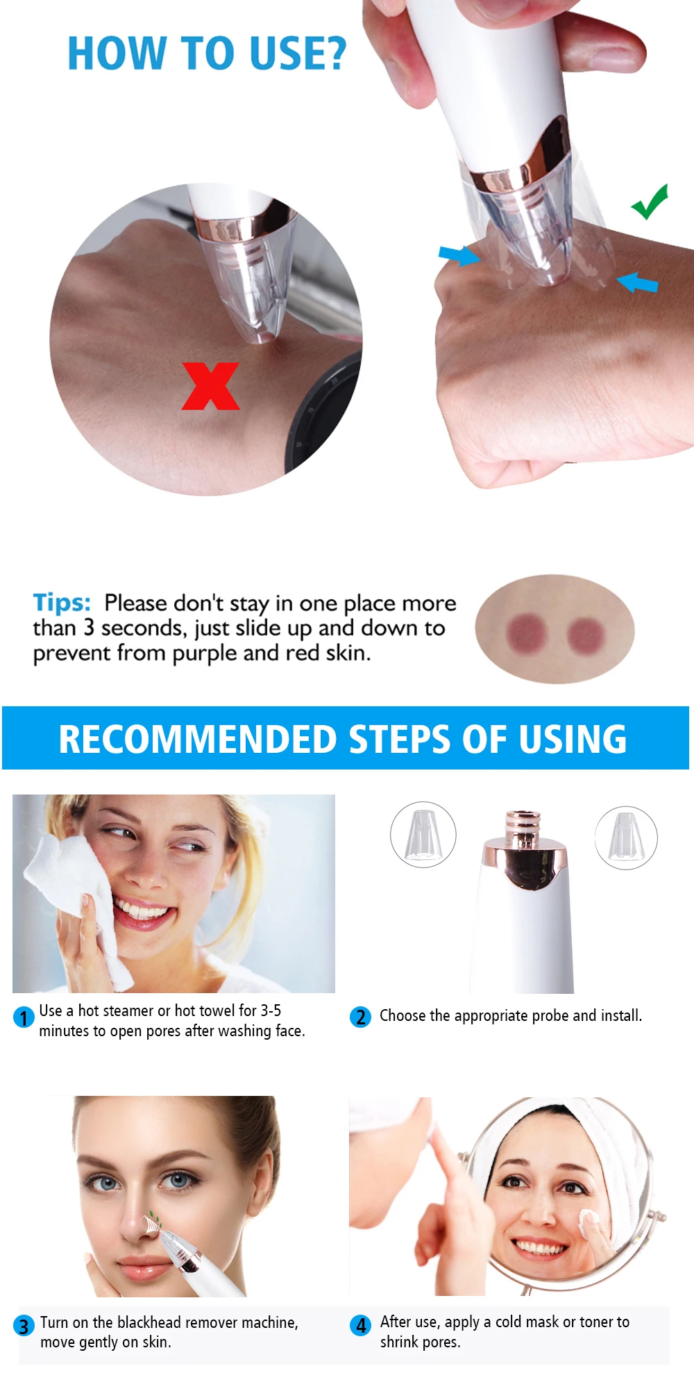 Продукт 2: Инструмент для удаления чёрных точек маска для ухода за кожей лица очистить поры вакуум акне Удаление прыщей режущей кромкой и вакуум-отсосом лица алмазное абразивное удаление дефектов кожи станок Посылка включает в себя: 1 * Электрический вакуумный инструмент для удаления чёрных точек очиститель (основной блок) 5 * заменимая всасывающая головка 1 * USB кабель 1 * Руководство пользователя