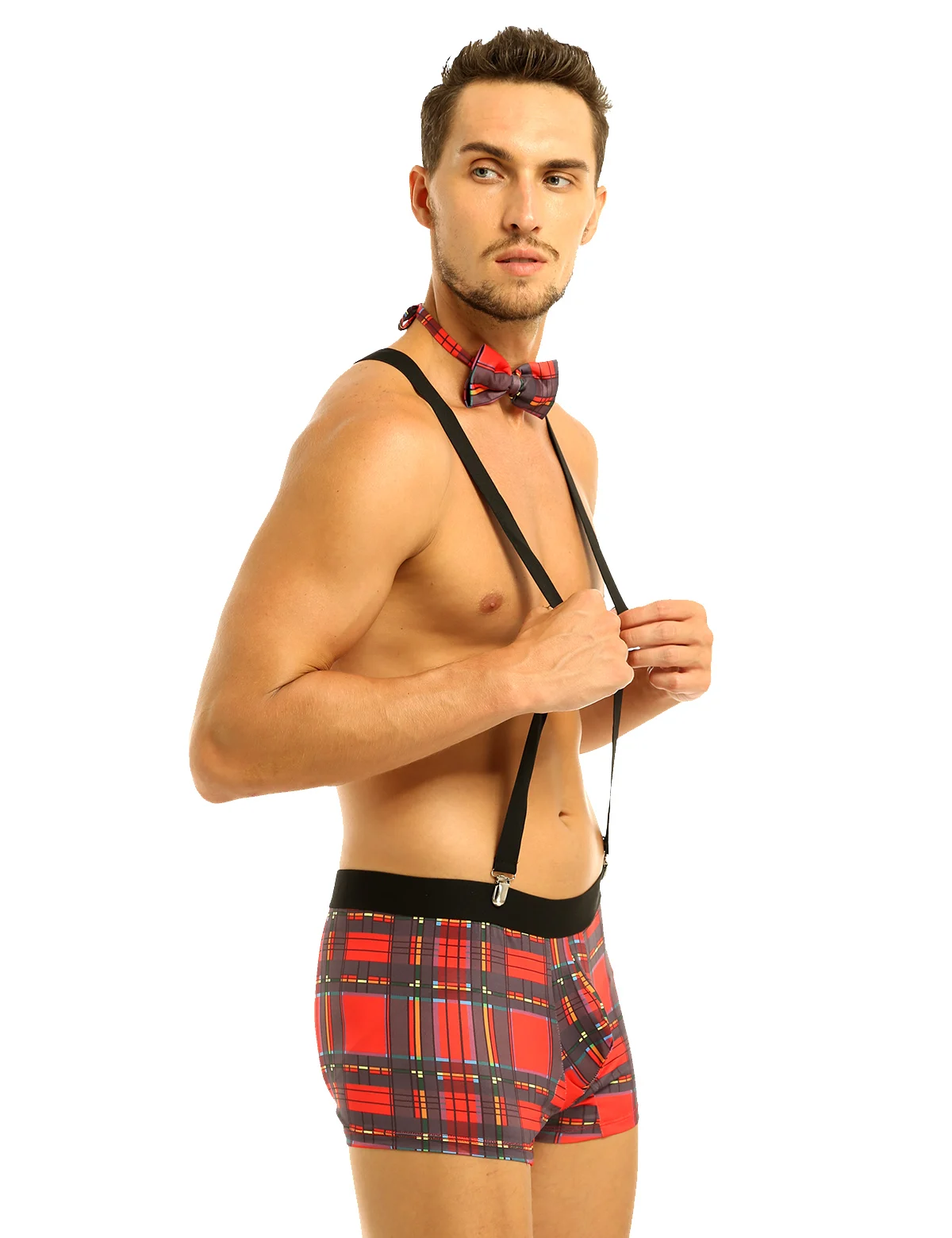 Эластичные y-образные подтяжки с 3 металлическими прочными зажимами для подключения ваших трусов-боксеров. Клетчатая галстук-бабочка с длинными лямками сзади.