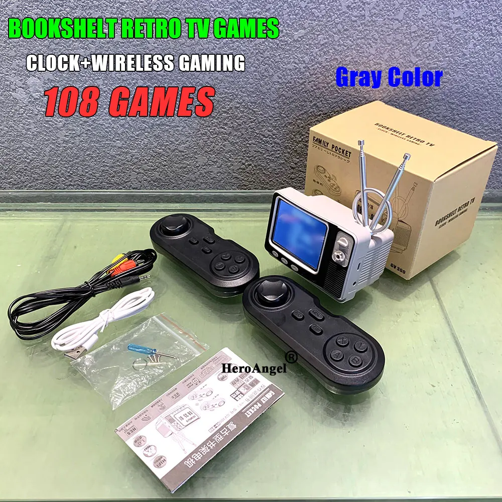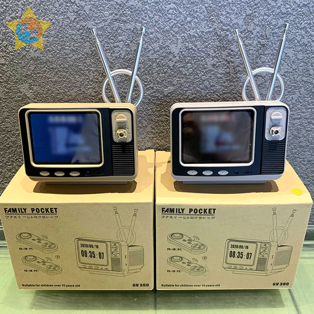 Item name: GV300 Retro Bookshelf TV Game Color: bronze/sliver (optional) Material: ABS Power: TV: 2 x 14500 Lipo battery/2 x AA battery (not included); handle: 500mah Lipo battery Charging time: TV: 45-60mins; handle: 30mins Service time: TV: 5hrs; handle: 6-12 months Size: TV: 3.9 x 3 x 2.8 in; handle: 5 x 2 x 0.8 in Weight:350g