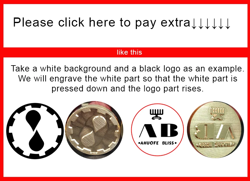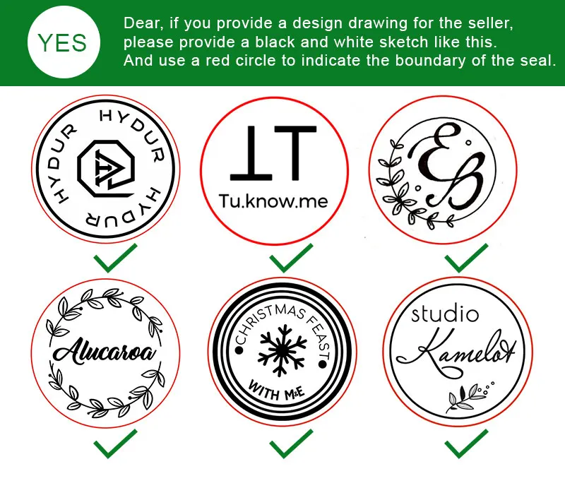 Если вам нужно заказать специальная печать. Вам просто нужно разместить заказ как обычно и предоставить свой логотип. Отправьте мне изображения JPG или PNG здесь. Для обозначения края уплотнения необходимо использовать красный круг. Если ваш рисунок содержит черные круги, пожалуйста, сообщите мне, хотите ли вы его выгравировать. Пожалуйста, отправьте векторный логотип на мою электронную почту, 1837974325@qq.com темой электронной почты является номер и размер вашего заказа. Е. Г. 30 мм #123456789