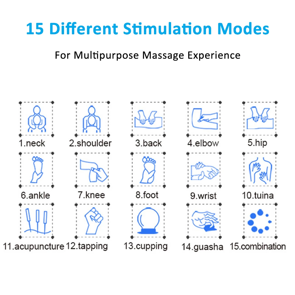 1. Шея 2. Плечо 3. Назад 4. Локоть 5. Бедра 6. Ботильоны 7. Колено 8. Ступня 9. Запястье 10.Tuina 11. Иглоукалывание 12. Постукивание 13. Обрезание 14. Гуаша 15. Комбинация