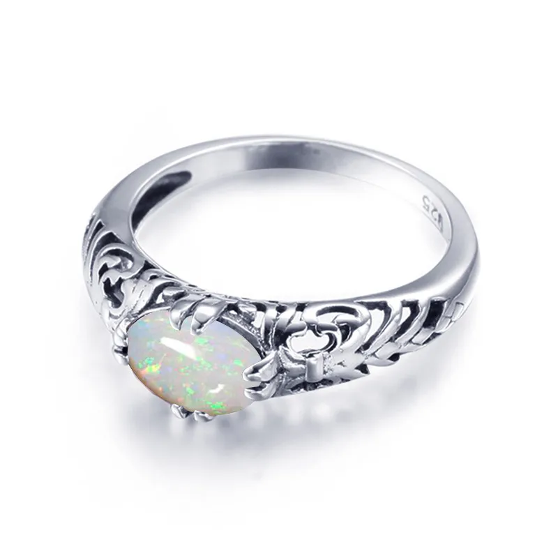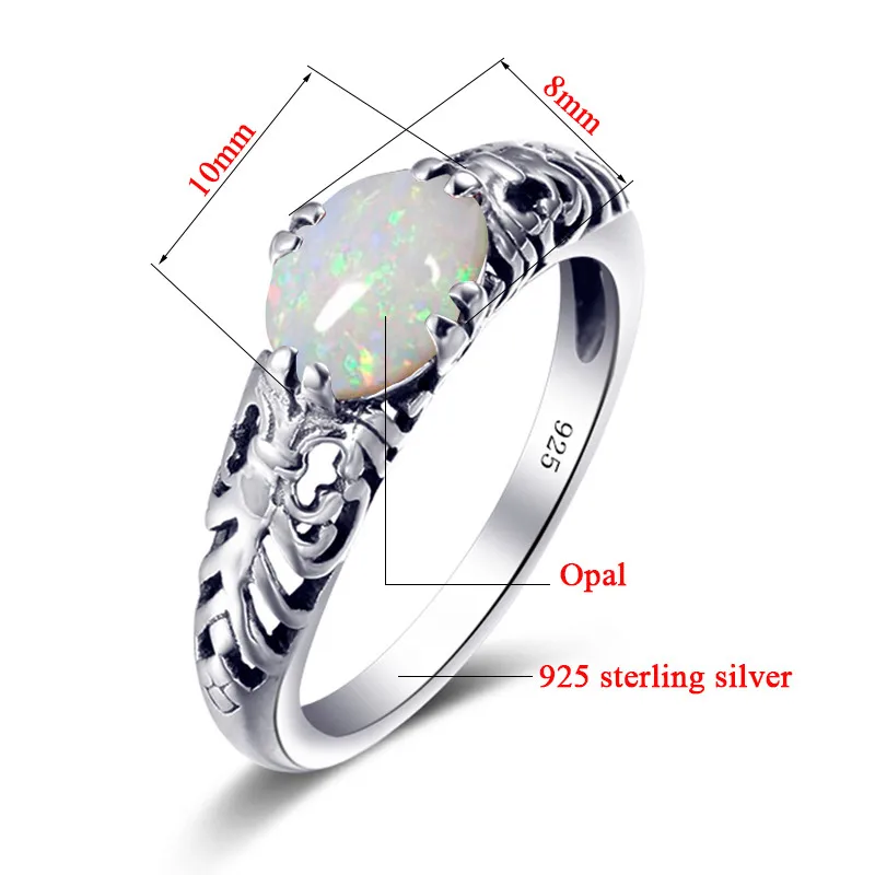 Бренд: Rosewood Story Тип камня: синтетический опал Размер основного камня: 6*10 мм Цвет камня: белый огонь Форма камня: Овальный Тип металла: серебро 925 пробы Матовый цвет: античное серебро Вес изделия: 2,6 г Размер кольца: США #5,#6, #7,#8,#9,#10