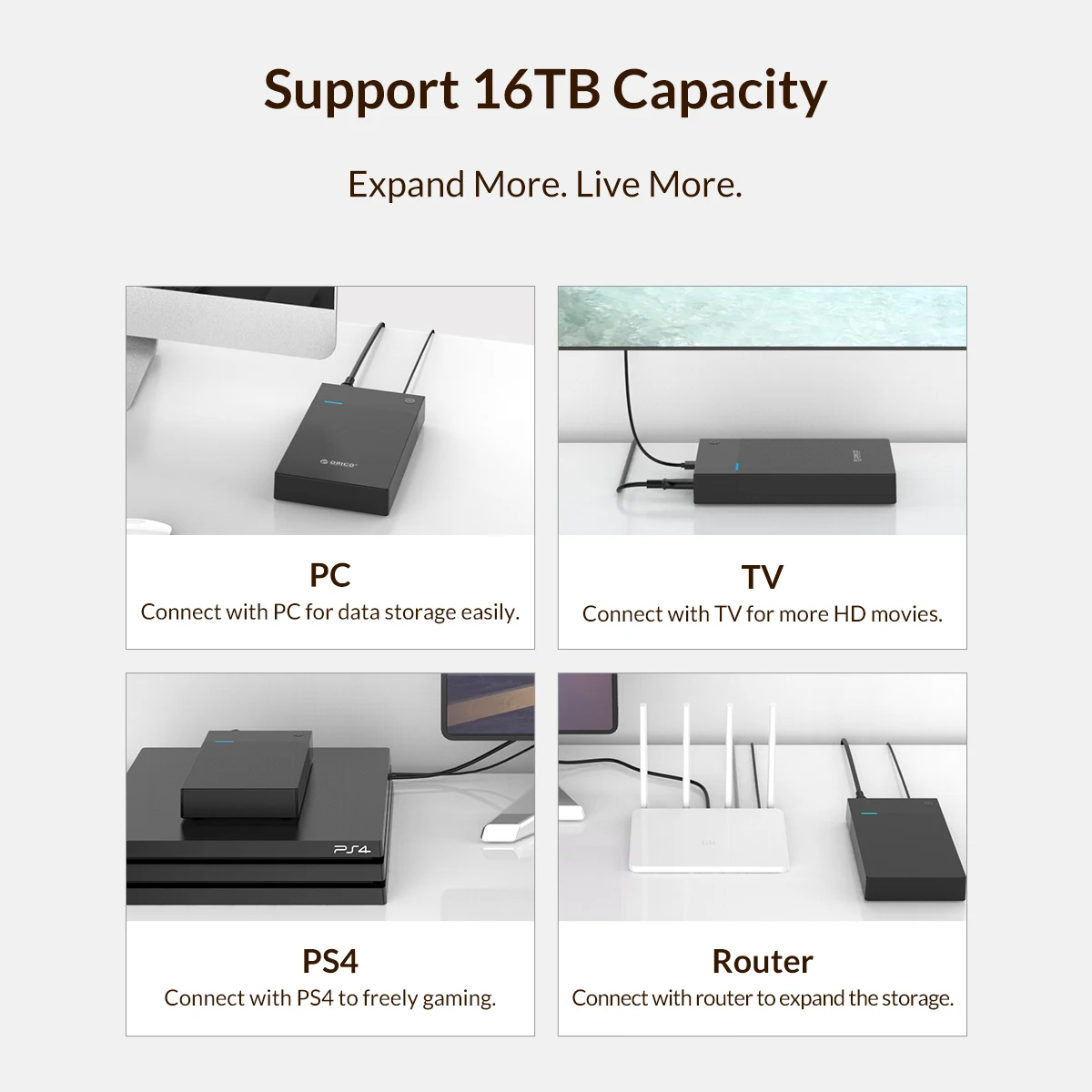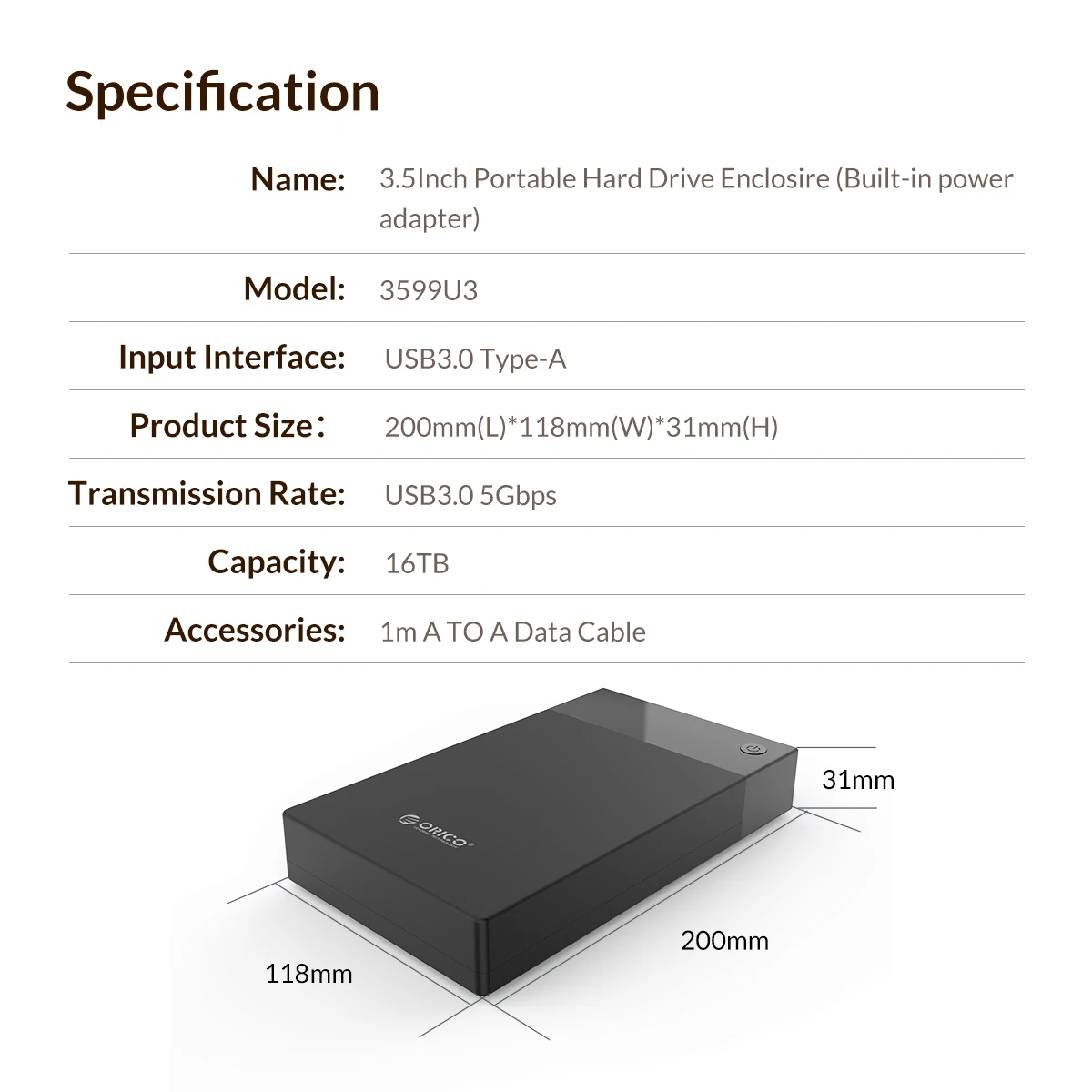 ORICO 3588US3 3,5 дюймов жёсткий диск или поддерживающий корпус может поддерживать почти любой 3,5 дюймов SATA I, SATA II жесткий диск SATA III или твердотельный накопитель до максимально 16 терабайт!