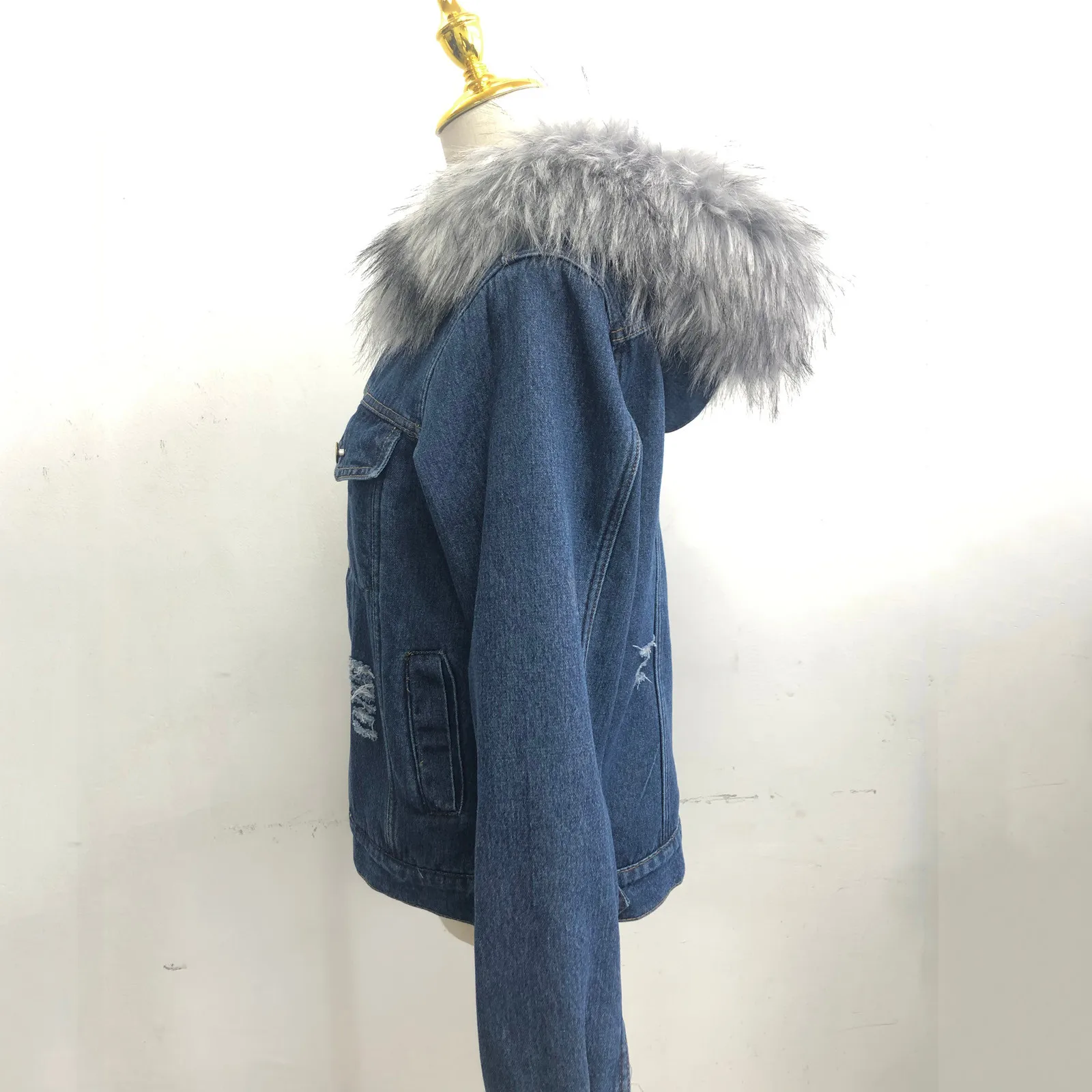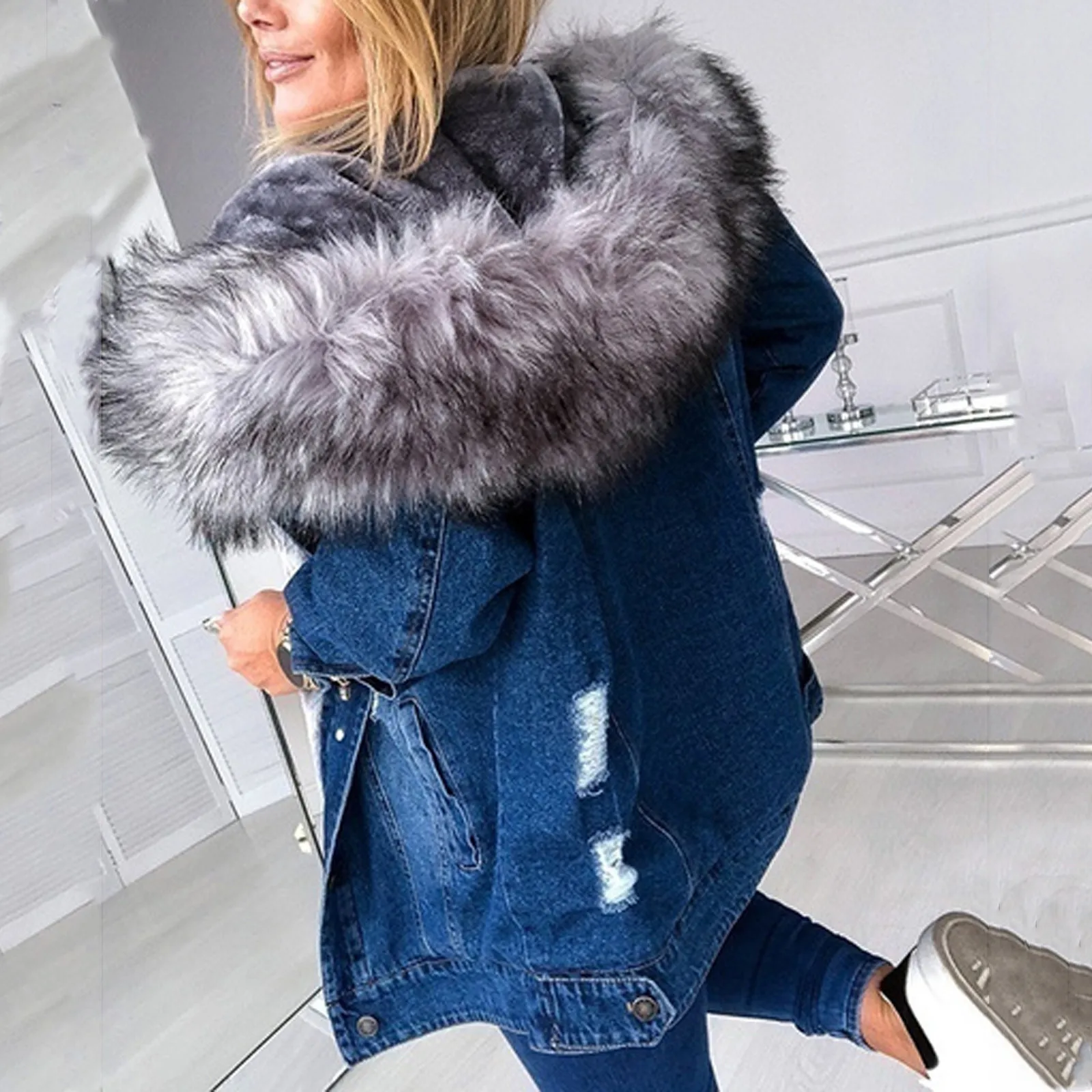 Женское однотонное джинсовое пальто с длинными рукавами и меховым воротником