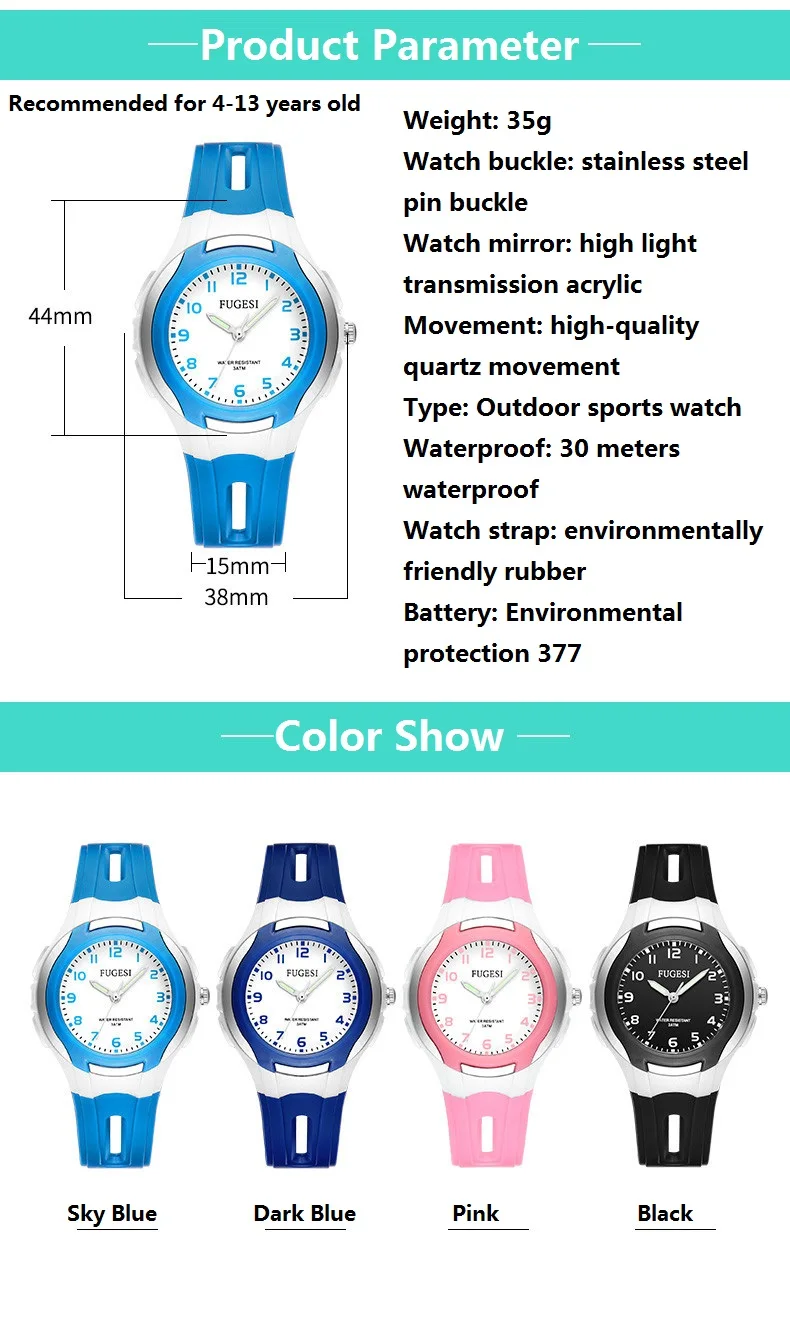 Параметры продукта Вес: 35 г Пряжка часов: Пряжка из нержавеющей стали Зеркало часов: Акриловый высокий светильник Механизм: кварцевый механизм высокого качества Тип: спортивные часы на открытом воздухе Водонепроницаемость: 30 метров Водонепроницаемость Ремешок для часов: Экологически чистая Резина Батарея: охрана окружающей среды 377 Рекомендуется для детей 4-13 лет