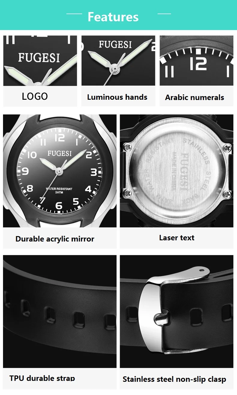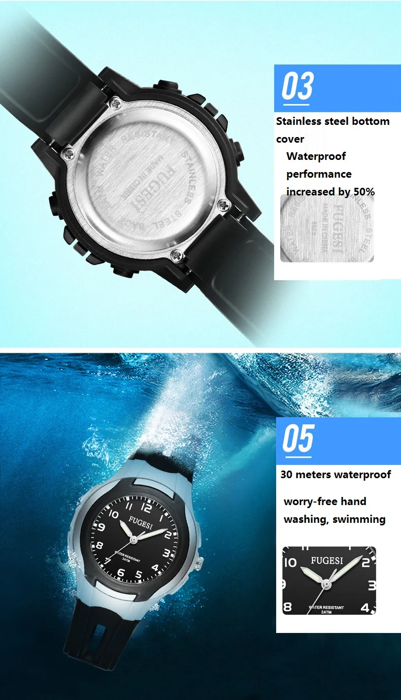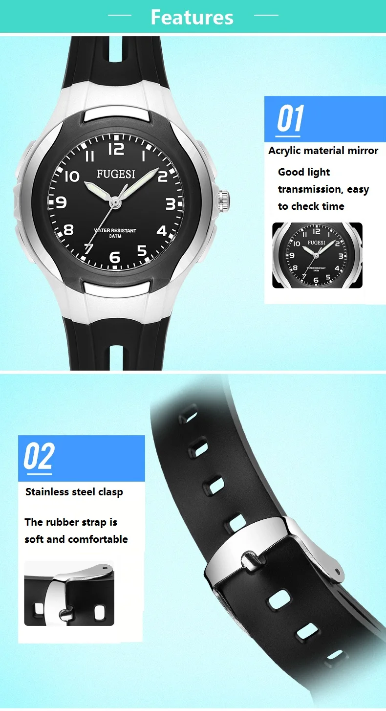 1. Акриловое зеркало Хороший светильник, легко проверить время 2. Застежка из нержавеющей стали Мягкий и удобный резиновый ремешок 3. Нижняя крышка из нержавеющей стали Водонепроницаемость увеличена на 50% 5,30 метров водонепроницаемый, Беззаботная ручная стирка, плавание