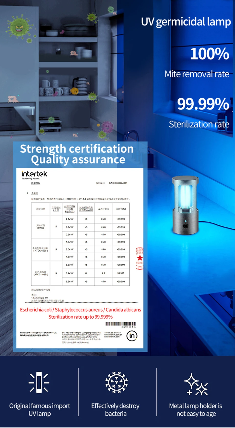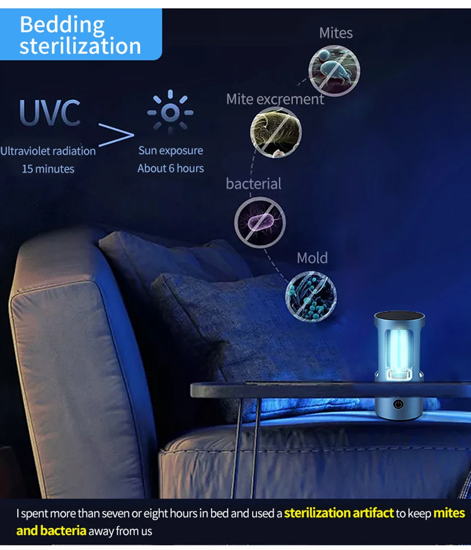 1. Пылезащитные клещи: пылевые клещи-это крошечные создания, которые невидимы невооруженным глазом, на кровати, подушке, диване, ковре, они повсюду в доме и причиняют много вреда: пылевые клещи укусывают кожу людей, делают зуд и покраснение кожи, позволяют людям не спать и не чувствовать дискомфорта. UV-C лучи этой лампы намного прочнее солнечного света, они могут немедленно убить пылевые клещи.