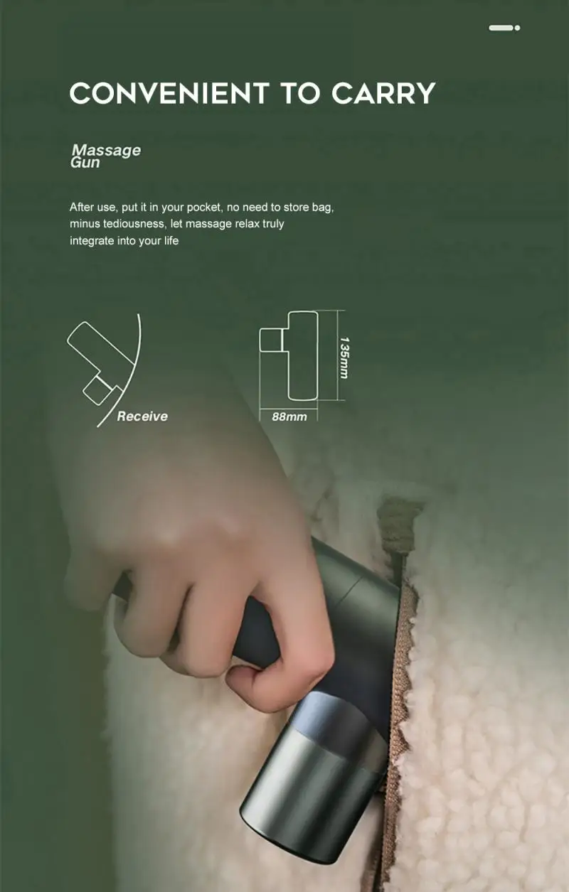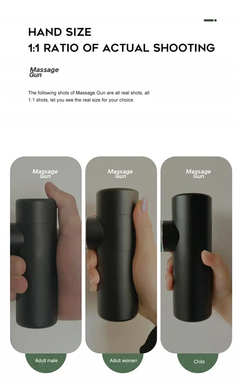 -Портативный мини-массажный пистолет: 5,4 дюйма мини-размер, вес всего 365 г. Легкий и портативный, вы можете положить его в сумочку или карман, и использовать его дома, в офисе, в тренажерном зале или на открытом воздухе и т. Д. Если у вас есть этот маленький массажер, вы можете снять мышечную усталость и боль в любое время и в любом месте.