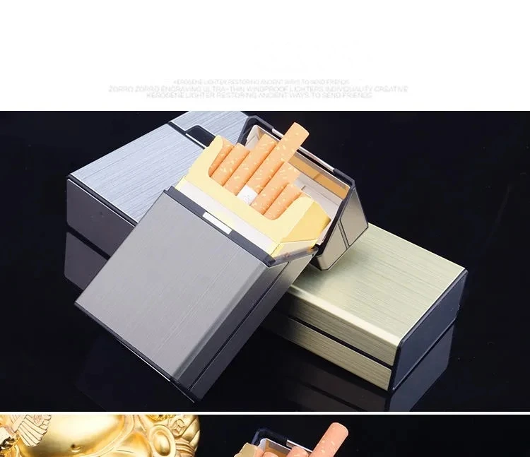【Название продукта 】: чехол для сигарет из алюминиевого сплава 【Емкость: 20 сигарет 【Материал 】: алюминиевый сплав + пластик 【Process】: высококачественный волочильный провод 【Цвет 】: золотой, серебряный, черный [Размер]: 9,3*5,9*2,9 см 【Пользовательский логотип 】: бесплатно