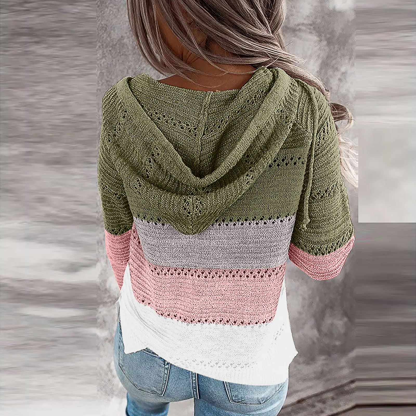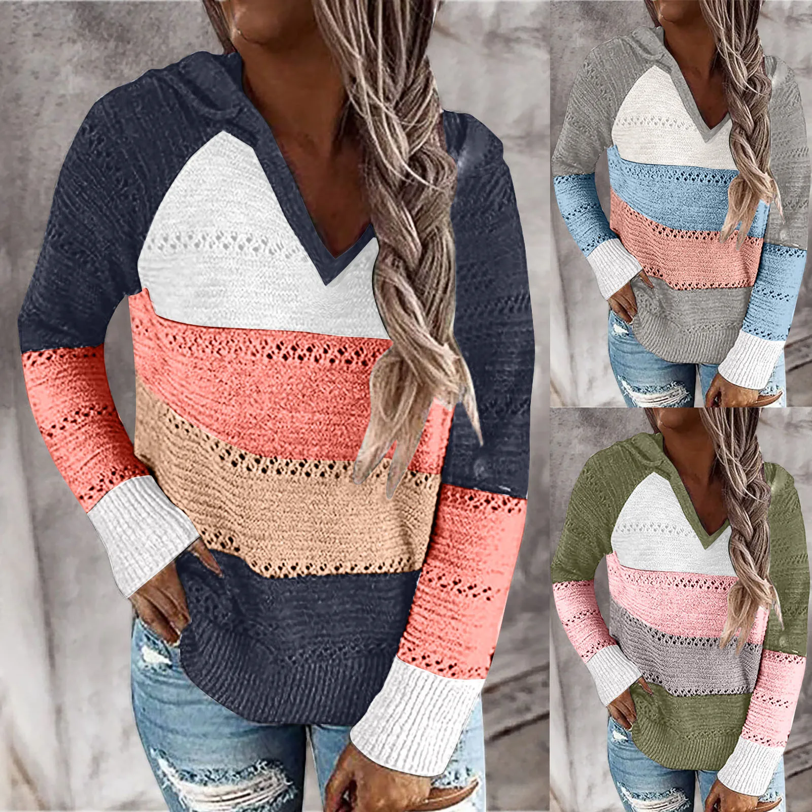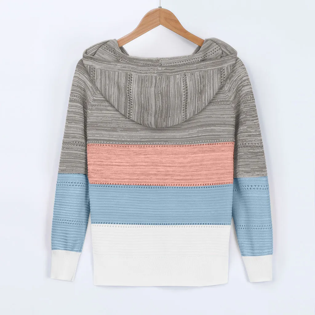 Fashion Women Casual Patchwork V-Neck Long Sleeves Hooded Sweater Blouse Tops