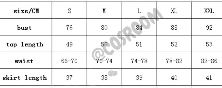 XL:bust 88cm waist 78-82cm top length 52cm skirt length 40cm
