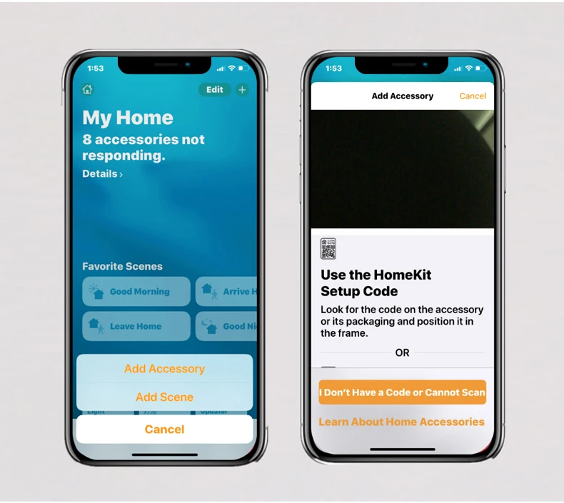 4. Откройте приложение Apple Home и нажмите +, чтобы добавить аксессуар, отсканировать код или выбрать «У меня нет кода или нет сканирования», чтобы установить вручную