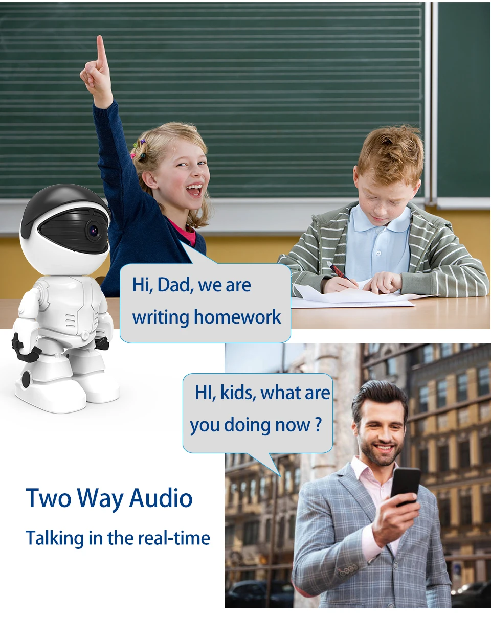 Спецификация Название продукта: милая камера-робот Ночное видение: 5 ~ 10 м PTZ: горизонтальный 355 °, вертикальный 90 ° Поддержка: IOS , Android 4,0 или выше Стандартное кодовое изображение: H.264 поток/Разрешение: двойной поток/1920*1080 функция хранения: облачный recroding/карта памяти (поддерживает 128G) Мощность: 5 В постоянного тока 1A Рабочая температура: 0 ℃ ~ 55 ℃