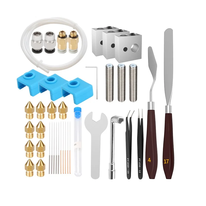 Запчасти для 3D-принтера DIY Kit, набор аксессуаров для 3D-принтера включает 42 детали для ПК (E3D V6 быстрый разъем + KJH 04-M6 Пневматический разъем * 2 + M6 * 30 мм полный резьбовой шланг из ПТФЭ * 3 + острый mk8 латунь 1,75/0,4 мм * 10 + открытый гаечный ключ 6 мм * 1 + MK7 нагревательный блок (Резьба m6) * 3 + mk7 / mk8 нагревательный алюминиевый блок синий силиконовый рукав * 3 + 2 мм гаечный ключ (2*16*50)* 1 + чистой стали иглы 0,4 мм * 5 + AST0.35mm * 5 + молочно-белый тефлоновая трубка 2*4 комплект 1 метр + PT.ESD-15 Пинцет + PT.ESD-12 пинцет + нержавеющая сталь нож для чистки нет. 17 + чистящий нож из нержавеющей стали No. 4 + l-образный ключ 6 мм) Использование: Очистите насадку