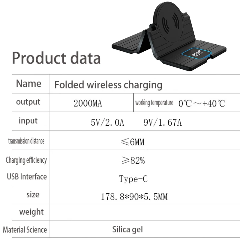 Материал: силикон Вход: 5 В/2 а 9 В/1,67 А Выход: 5 Вт/7,5 Вт/10 Вт/15 Вт Интерфейс: Type-C Расстояние передачи: ≦ 6 мм Эффективность зарядки: ≧ 82% Посылка включает: Силиконовое складное Беспроводное зарядное устройство * 1 Usb-кабель для передачи данных * 1 Руководство * 1