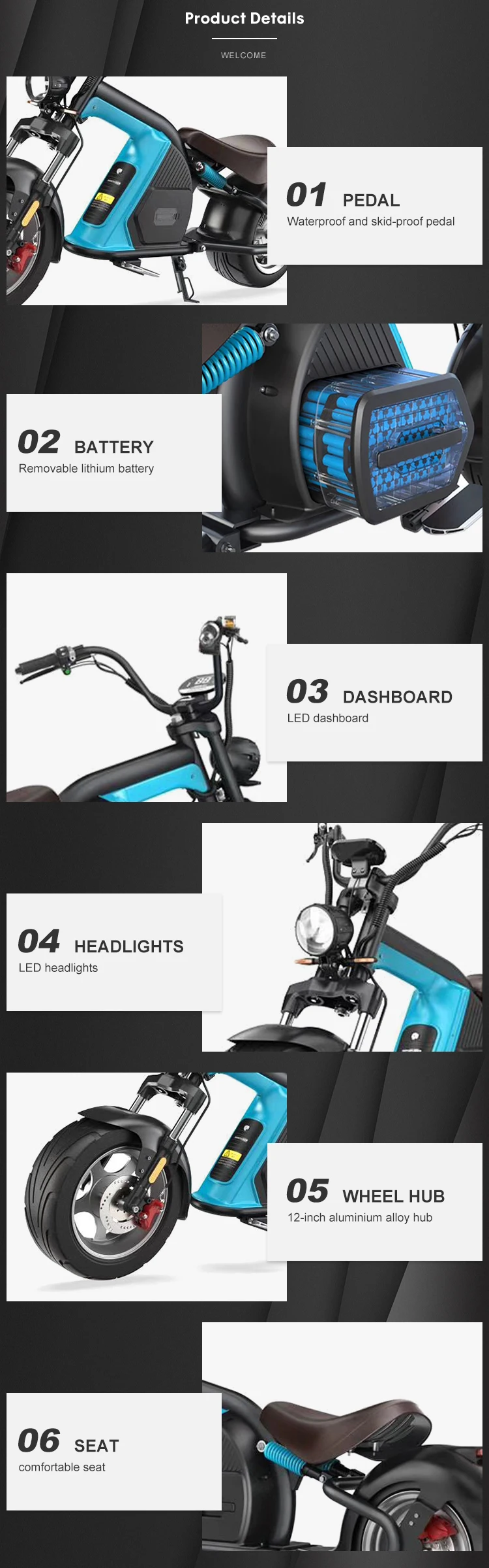 Модель M8 Напряжение 60 в Сертификация CE,EEC Мощность 2000 Вт Аккумулятор 60V/20AH съемный литий Батарея Максимальная скорость 45 км/ч За зарядку 36 км Размер колеса 12 дюймов Светильник Передний/задний/поворотный Прочее Рог/скорость/зеркало/сигнализация