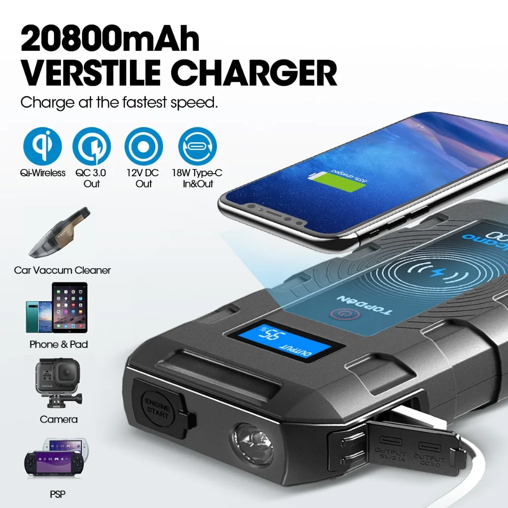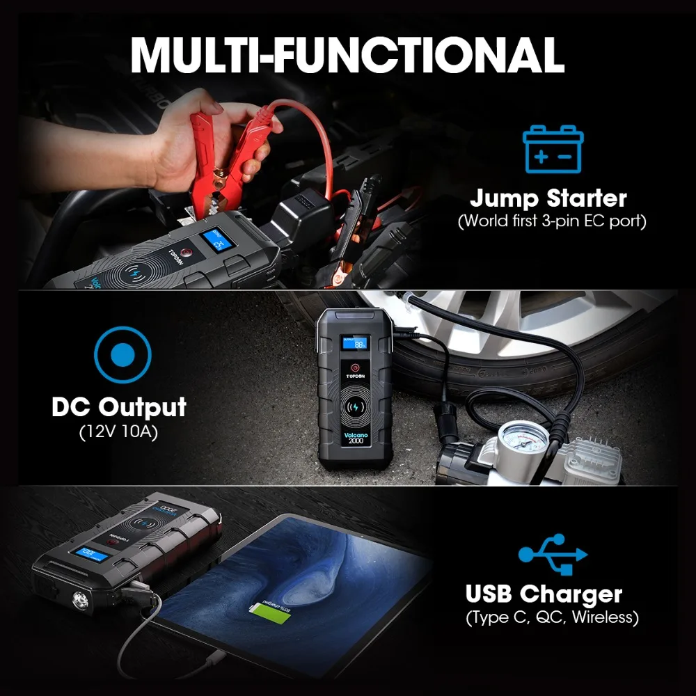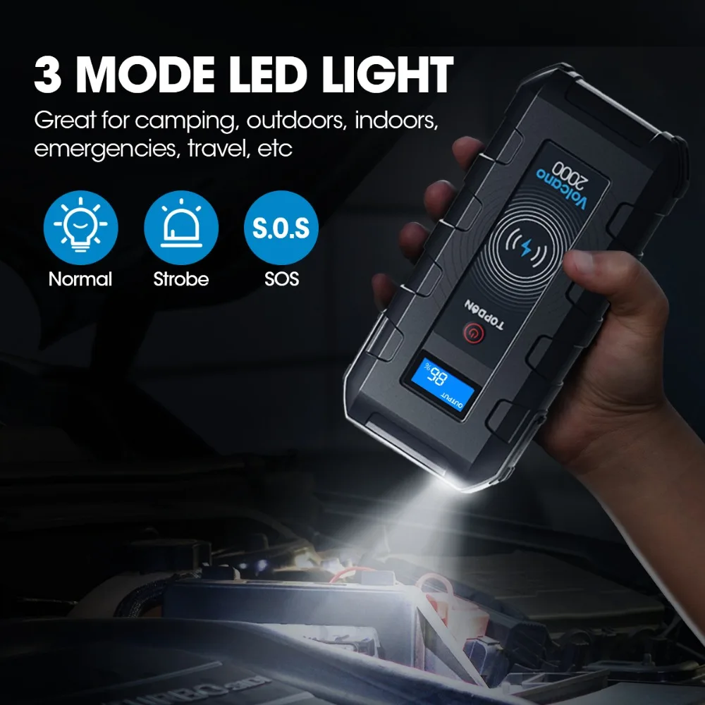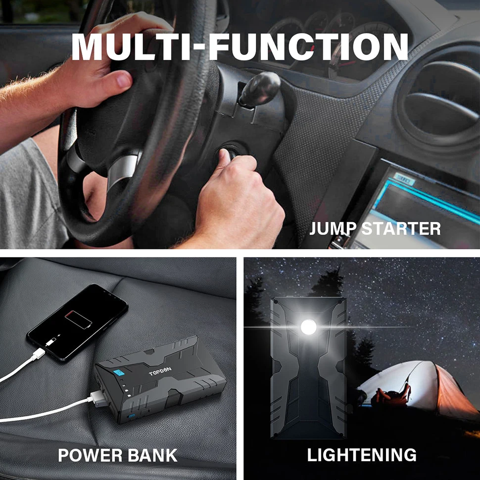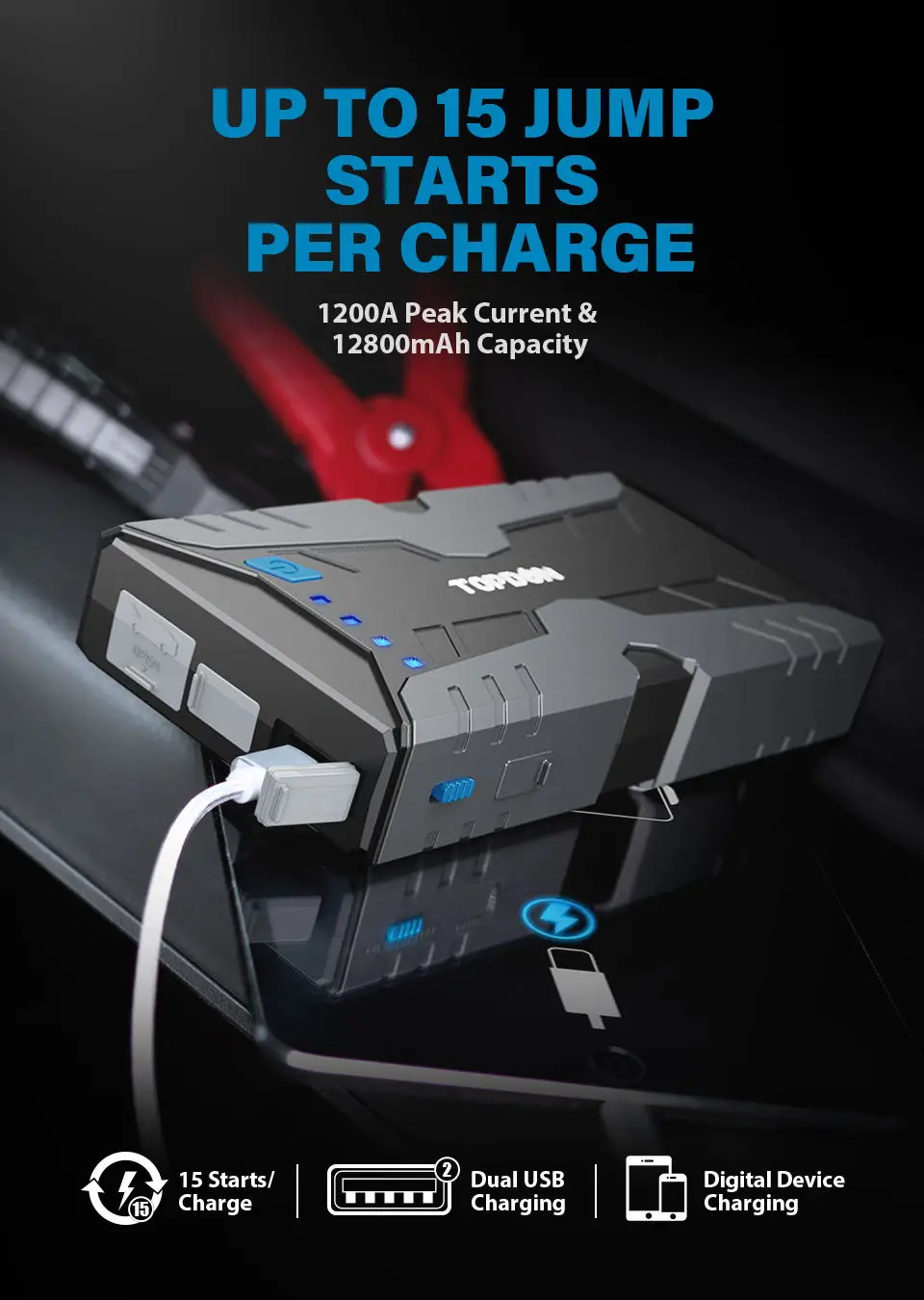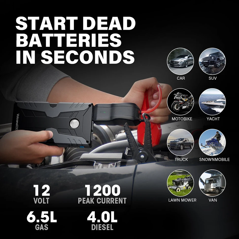 Предназначен для автомобилей, грузовиков, лодок, мотоциклов, косилок, TOPDON Volcano1200-это легкий в переноске стартер, содержащий больше энергии для ваших различных потребностей в чрезвычайной ситуации во время запуска скачка, ночного освещения, активного отдыха, самостоятельного вождения и природных катаклизмов. Volcano1200 разработан с несколькими защитой, таким образом, чрезвычайно безопасен для любого пользователя, и процесс запуска скачка не наносит вреда вашему автомобильному аккумулятору.