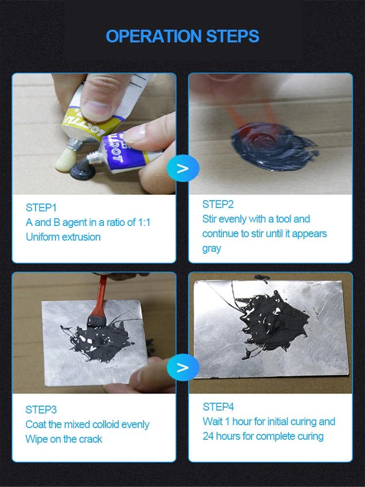 Используется для литья металлического ремонта. Изготовлен из эпоксидной смолы, отвердителя, отвердителя, активного разбавителя и различных высококачественных материалов.