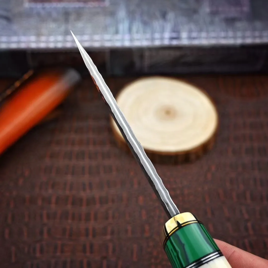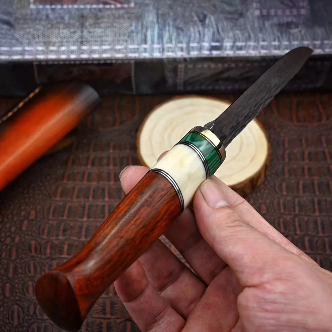 Спецификация: Общая длина: 21 см Длина лезвия: 9,8 см Ширина лезвия: 3 см Толщина лезвия: 0,3 см Сталь лезвия: VG10 Дамасская сталь Длина ручки: 11 см Твердость: 60 HRC Ручка: розовое дерево… Ножны: Высококачественная кожа ручной работы