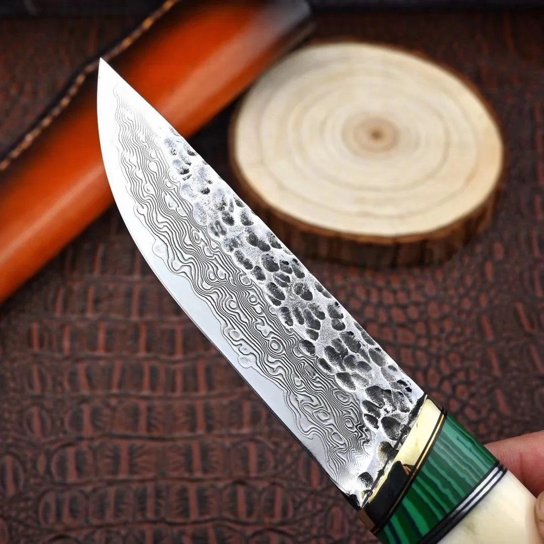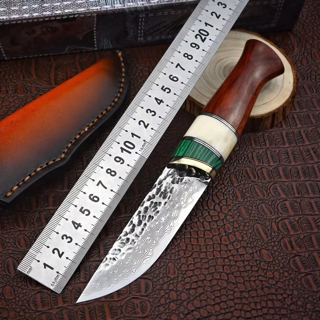 Дамасская сталь фиксированный нож с бычьей костью Бирюзовая деревянная ручка Открытый тактический инструмент для выживания VG10 охотничий прямой нож
