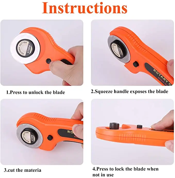 1. Набор вращающихся инструментов для резки, 2 размера на выбор, потрясающая четкость, острый нож, подходит для резки бумаги, джинсовой ткани, винила и других материалов. 2. Есть больше комплектов швейных аксессуаров. С ясным масштабом, подходит для левых и правых рук, с острым лезвием, можно разрезать до 6 слоев одновременно. 3. Уникальный самозаживляющий коврик может защитить ваши ремесленные ножи, двухсторонние, долговечные, является идеальным подарком для производителей и любителей. 4. Благодаря высококачественным лезвиям из нержавеющей стали с прочным острым краем и эргономичной скульптурной ручкой, для точного вырезания до кончика на большом разнообразии материалов.