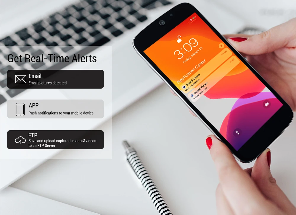 Всю эту систему наблюдения можно получить доступ и управлять удаленно через ваш смартфон, планшет и ПК. После срабатывания обнаружения движения вы можете мгновенно получать оповещения по электронной почте со снимками и уведомлением приложения, даже когда вы находитесь в отъезде.