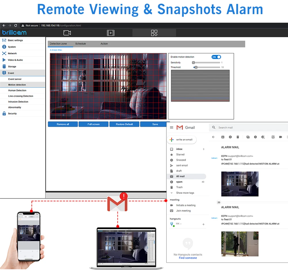 Вы можете выделить соответствующие области для обнаружения движения, чтобы освободить себя от ложных предупреждений. Всякий раз, когда срабатывает обнаружение движения, вы получаете мгновенные оповещения по электронной почте со снимками и уведомлениями APP, чтобы можно было принять соответствующие меры предосторожности.
