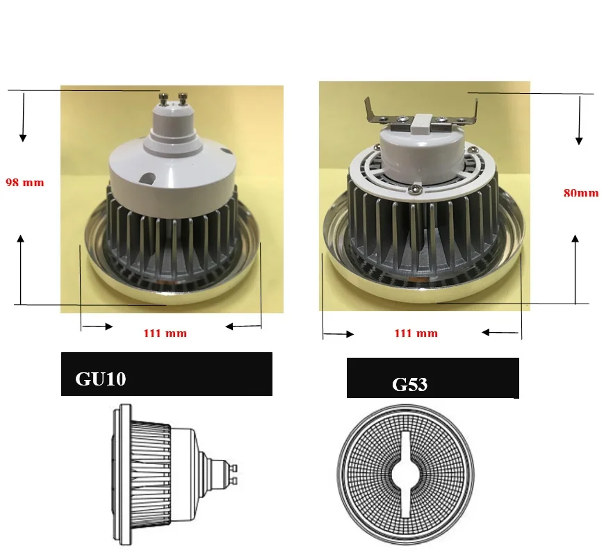 Детали светодиодной лампы AR111 1. Светодиодный бренд: Epistar 2. Эффективность светодиодов: 100 ~ 110 лм/Вт 3. Светодиодный срок службы: > 30000 часов 4. Потребляемая мощность: 12 Вт 15 Вт 5. Входное напряжение: 12 В постоянного тока 6. Эффективность электропитания: >90% 7, светильник flux: 1400lm 1600LM 8, CRI: Rz = 80 9, угол луча: 8 ° 15 ° 10, чехол Материал: Алюминий 11, Диммируемый; Нет/да 12: теплый белый 2800-300k, белый 4000-4500k, холодный белый 6000-6500k 13, тип основания: GU10 G53 14, Цвет корпуса: серебристый, белый Изображения: 1) Прямая замена традиционных ламп 2) широко используется в освещении и украшении дома и в общественных местах