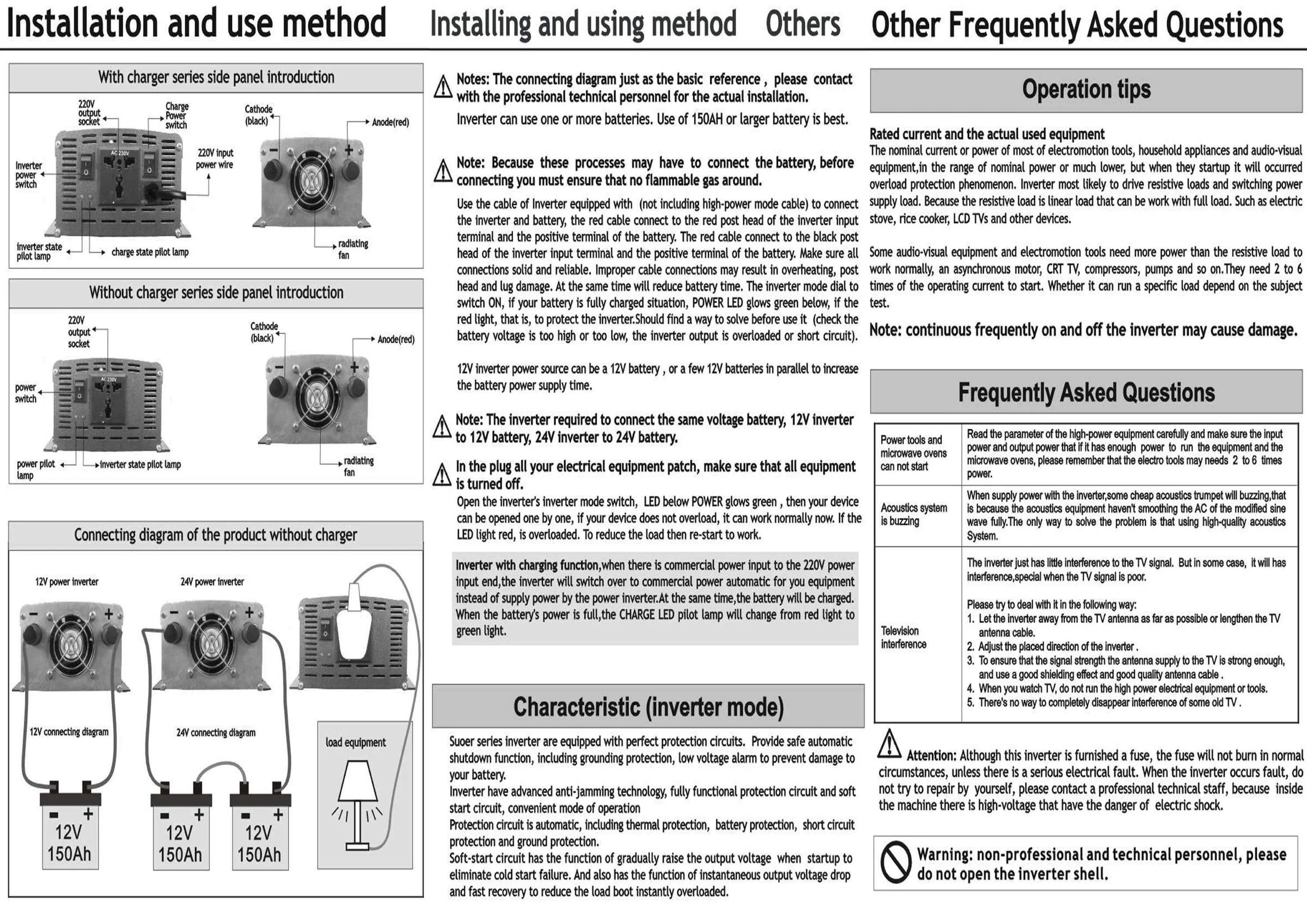 A. Этот продукт не должен соприкасаться с сильно коррозионными веществами. B. Строго запрещено изменять, разбирать, сбрасывать и ударять по распределительной коробке и изделиям самостоятельно, Избегайте попадания на поверхность и царапин поверхности твердыми предметами во время использования. C. Большое количество царапин или грязи на поверхности солнечной панели может привести к неэффективности модуля солнечной батареи, и в тяжелых случаях может привести к выгоранию. D. Подходящий диапазон температуры окружающей среды этого продукта: -20 ° C-80 ° C, пожалуйста, не превышайте этот диапазон. Е. Солнечная панель должна быть установлена в области с хорошим солнечным светом и без тени. Долгосрочная работа модуля солнечной батареи на солнце с тенью может иметь риск горения. F. Запрещено соединять положительные и отрицательные полюсы продукта вместе, и запрещено помещать продукт в воду или огонь, в противном случае это повредит продукт. G. Общая мощность фотоэлектрического модуля должна быть меньше номинальной мощности контроллера (номинальное напряжение × номинальный ток). Строго запрещено перегружать контроллер. H. Общее напряжение фотоэлектрического модуля, подключенного к контроллеру, должно быть в пределах диапазона входного напряжения фотоэлектрического контроллера. I. Инвертор может быть подключен только к батарее, а не непосредственно к контроллеру.