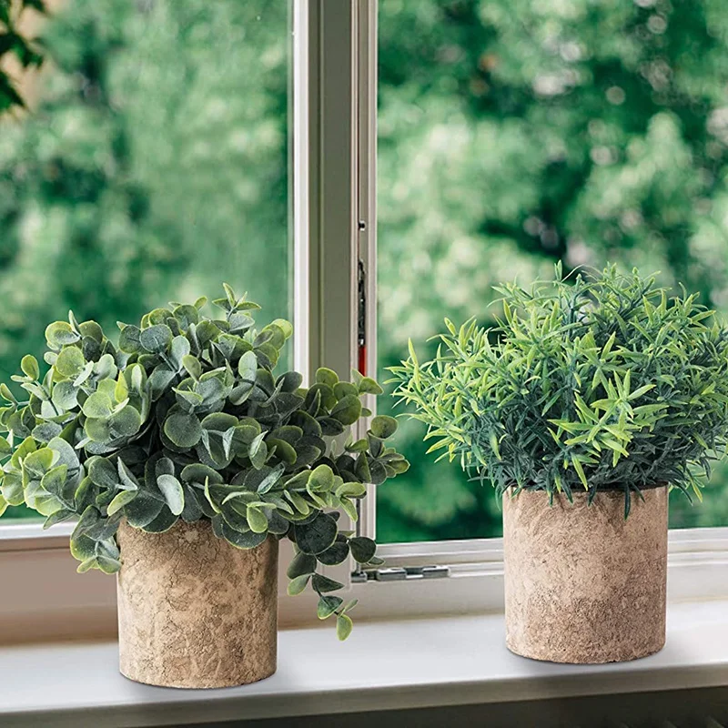 [Значение] 4 предмета искусственных растений в горшках, включая эвкалипт, самшит и розмарин; Различные стили зеленых тонов и деревенские цветные цветочные горшки-это прекрасные украшения или подарки.