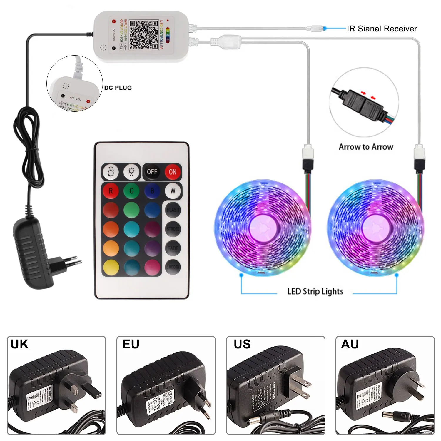 • 2,5 M RGB Светодиодные ленты 5050 + 24-кнопочный ИК-пульт дистанционного управления + Питание