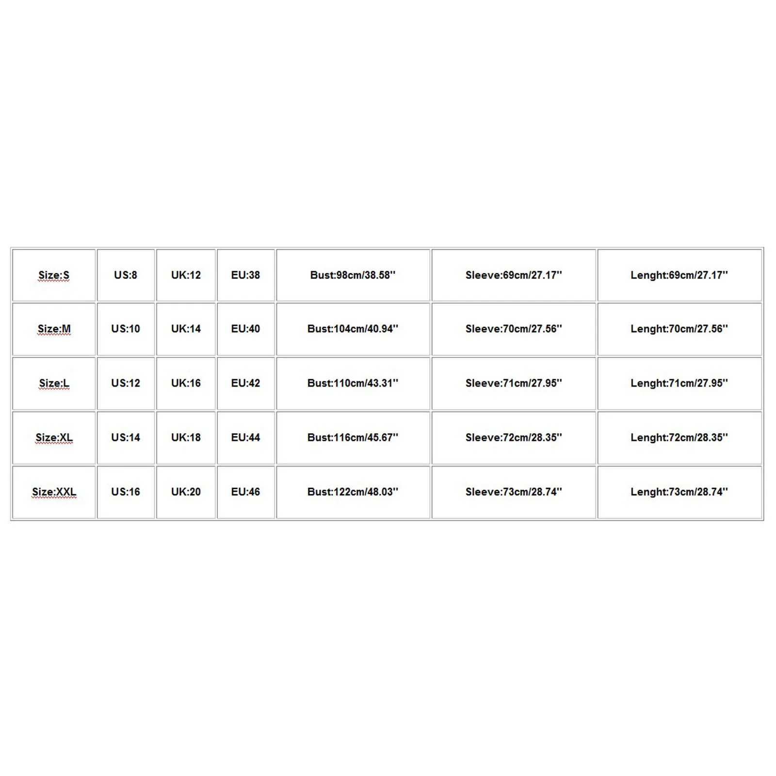 Размер США Великобритания ЕС Бюст Рукав Длина S 8 12 38 98 см/38,58'' 69 см/27,17'' 69 см/27,17'' М 10 14 40 104 см/40,94'' 70 см/27,56'' 70 см/27,56'' L 12 16 42 110 см/43,31'' 71 см/27,95'' 71 см/27,95'' XL 14 18 44 116 см/45,67'' 72 см/28,35'' 72 см/28,35'' XXL 16 20 46 122 см/48,03'' 73 см/28,74'' 73 см/28,74''