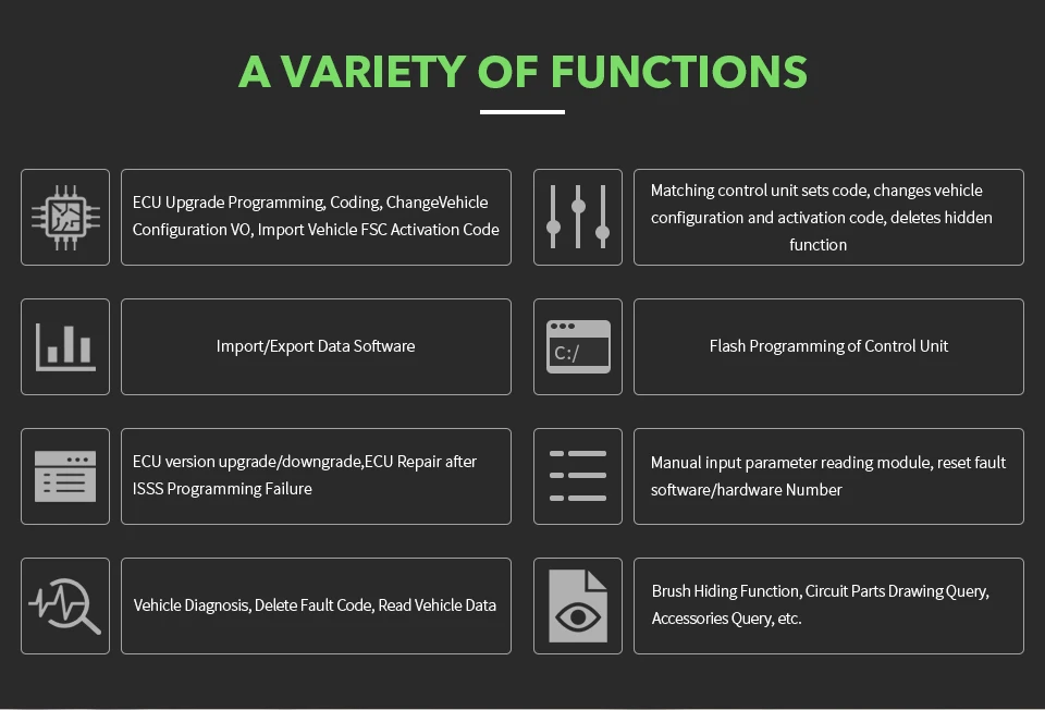 1) Эта ссылка имеет 4 варианта: «Только HDD»: только жесткий диск, не включает устройство, HDD включает программное обеспечение и систему win 7. «Устройство»: включает устройство, кабель и CD (только драйвер внутри CD, не включает программное обеспечение). Если ваш компакт-диск сломан, пожалуйста, не волнуйтесь, вы можете связаться с нами, мы отправим вам ссылку, чтобы установить его. «Устройство с HDD»: включает устройство, кабель, 500g HDD (программное обеспечение и систему win7). «Устройство с SSD»: включает устройство, кабель, 500g SSD (программное обеспечение и систему win7). Примечание: Если у вас нет официального программного обеспечения для BMW, вам нужно заказать HDD/SSD, потому что мы не Поддержка для предоставления ссылки на программное обеспечение для BMW. 2) VXDIAG SE Подходит для BMW Введение: Устройство поддерживает автомобильный год 2004-2020 для всех автомобилей BMW. Программное обеспечение может считывать поток данных в реальном времени, испытание на срабатывание, мониторинг, утилитарное тестирование, перепрограммирование, диагностику Код неисправности и так далее. 3) устройство поддерживает подключение Wifi и USB 4) основное диагностическое программное обеспечение включает в себя: (возможно обновление) Для BMW ISTA (версия программного обеспечения: ISTA/D-4.24.13--ISTA/P-3.66.100); Для BMW Group isi (четвертое поколение диагностического программного клиента BMW); ESYS (инженерное программное обеспечение для серии F, доступно для программирования, кодирования, Chinesization, реализации скрытого функцио-ns, расширенные функции); WINKFP (для серии E: программирование, обновление и понижение); Tool32 (введите ключ, коды импорта, удалите сертификацию, расширенные возможности для серии BMW); INPA (Чтение информации о транспортном средстве, диагностика, чтение и четкие коды неисправностей); Для кодирования BMW (для серии E: импорт данных, изменение кода или реализация скрытых функций); KSD2 (предлагаем полную информацию о ремонте автомобиля для диагностики или программирования); NCS-Expert tool (для серии E: набор кодов, реализация скрытых функций и изменение настроек); 5) программное обеспечение включает в себя инженерную версию, которая является быстрым и простым диагностическим программированием и Система кодирования для инженеров BMW. Программное обеспечение HDD/SSD разработано на английском языке. Инженерная версия настолько практична и мощна, что может Достичь профессиональных функций, которые все оригинальные профессиональные компьютеры могут осуществить, может изменить langu Возраст на китайский через порт OBD для импортных автомобилей (Европа регулирует автомобили, США и США Соединенные Штаты, Африка и т. Д.). 6) Особенности в основном включают: диагностику, программирование (включая. Программирование только один модуль), кодирование, реализовать hid Функция den, активация новых функций, обновление системы модуля.