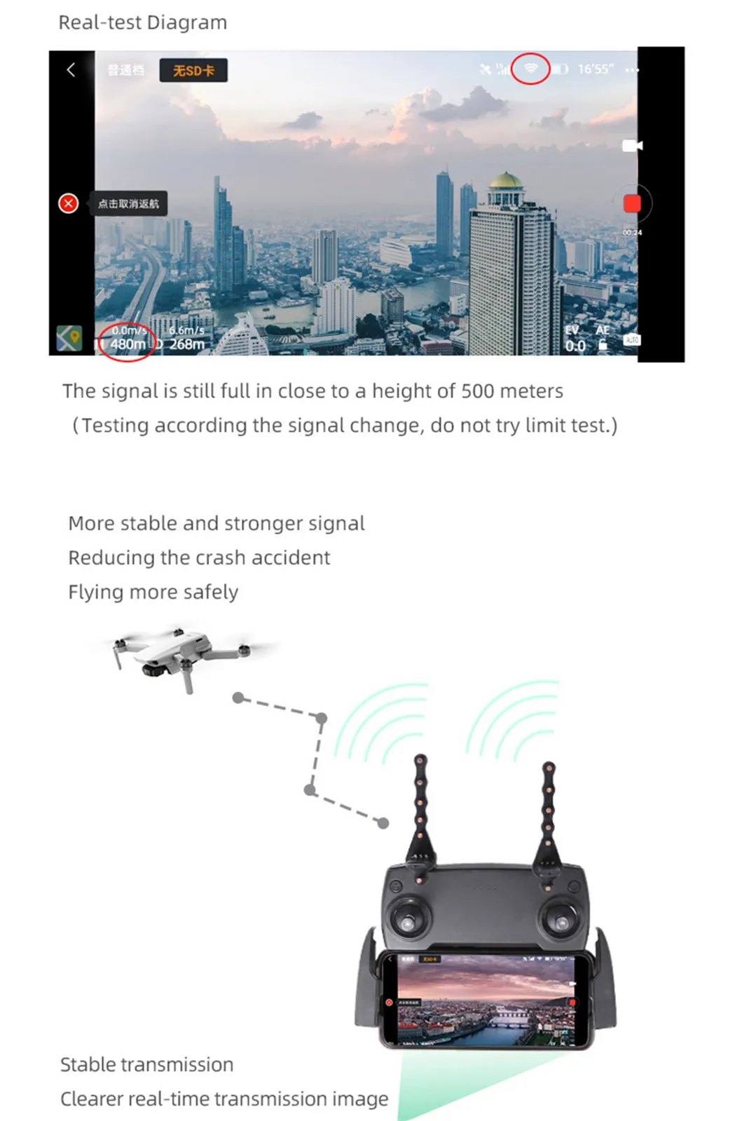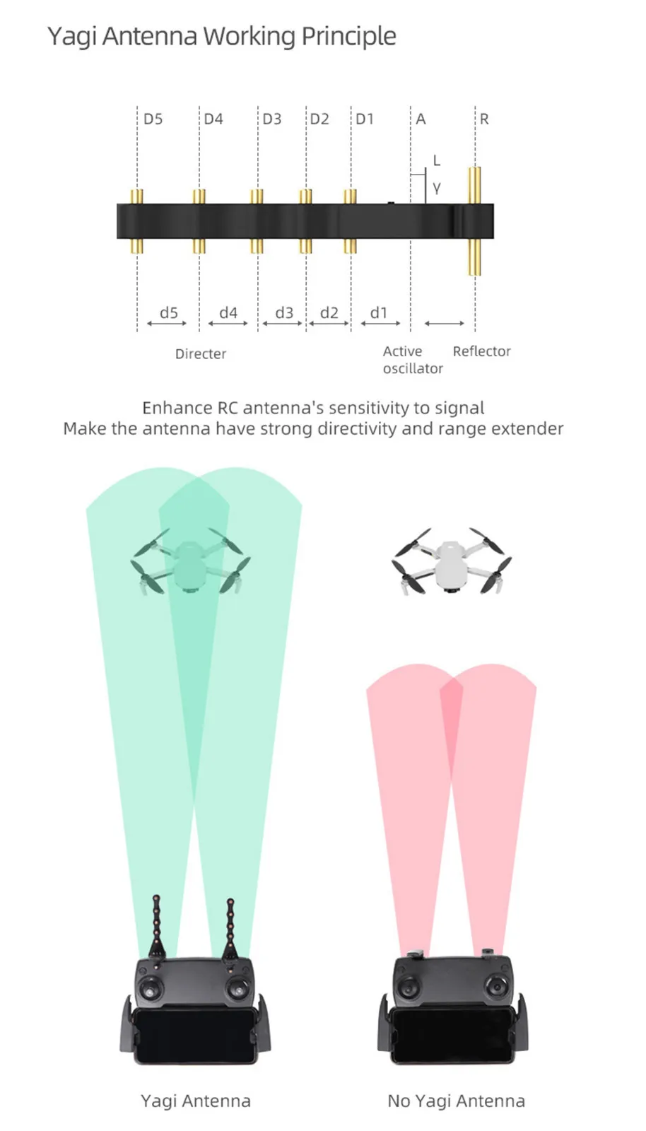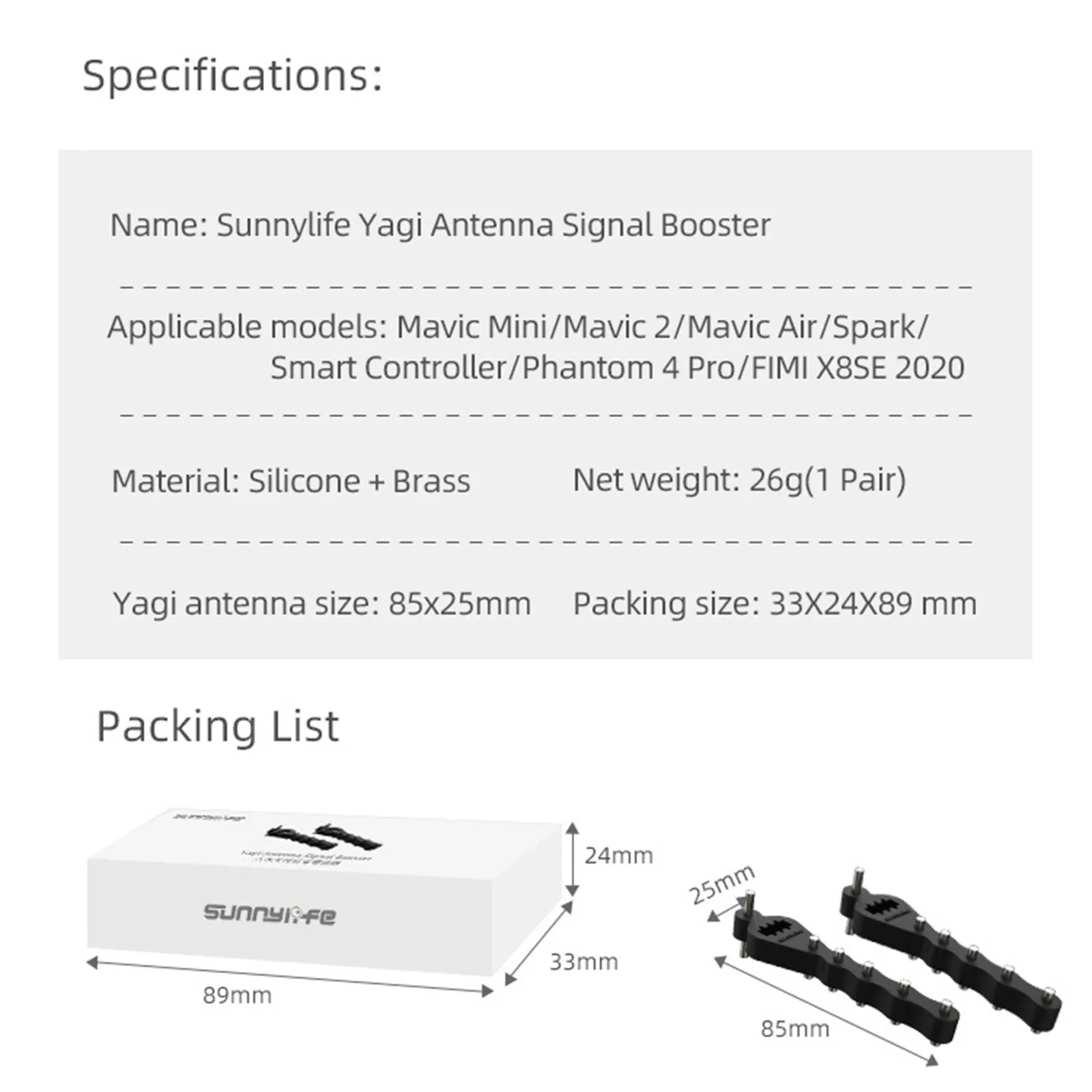 Размер изделия: 85 x 25 мм (антенна Yagi-Uda) Материал: силикагель + Латунь Вес нетто: около 26 г (1 Пара) Применимые модели: для Mavic Mini/2/Air/Spark, пульт дистанционного управления с экраном, Phantom 4 Pro, FIMI X8SE 2020 и т. дУпаковка включает в себя: