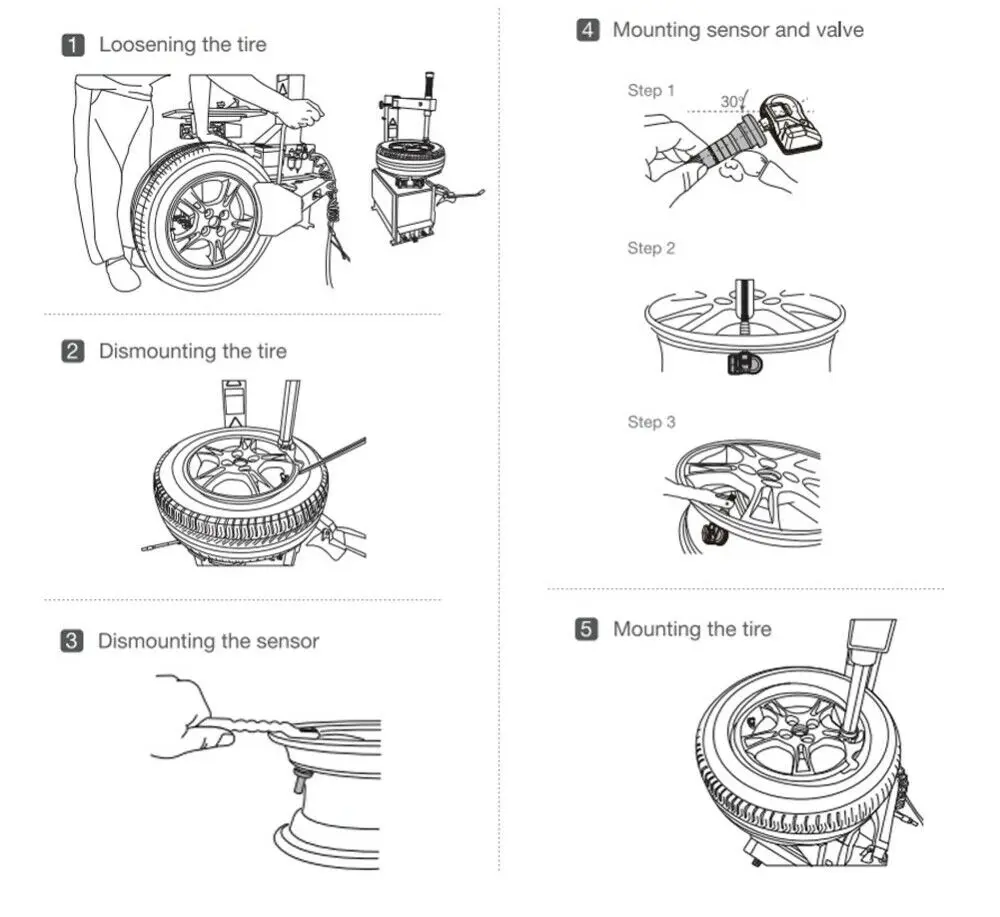 COMPREHENSIVE VEHICLE COVERAGE Installation Process 1. Loosen the tire: Remove the valve cap and core and deflate the tire. 2. Dismount the tire: Clamp the tire onto the tire changer, and adjust the valve at 1 o’clock relative to the tire separation head. Insert the tire tool and lift the tire bead onto the mounting head to discount the head. 3. Dismount the sensor: With a screwdriver remove the fastening screw and sensor from the Valve stem, then loosen the nut and remove the valve. 4. Mount sensor and valve: Slide the valve stem through the valve hole of the rim. Tighten the screw-nut with 4.0 Nm with the help of the positioning pin. Assemble the sensor body against the rim and tighten the screw. 5. Mount the tire: Place the tire on the rim, making sure that the valve faces the separation head at an angle of 180 degrees. Mount the tire over the rim.